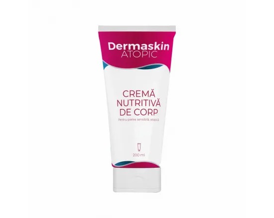 DERMASKIN ATOPIC Cremă Nutritivă de Corp, 200 ml: Descriere Produs: DERMASKIN ATOPIC Cremă Nutritivă de Corp este concepută special pentru pielea foarte uscată și predispusă la dermatită atopică. Formula sa conține complexul de fosfolipide biomimetice care îmbunătățește bariera hidrolipidică a pielii, ajutând la păstrarea umidității și oferind o hidratare profundă. Ideală pentru utilizarea zilnică. Beneficii: Hidratează și calmează pielea uscată și iritată. Ameliorează pruritul și iritarea. Protejează pielea împotriva infecțiilor. Formula sa specială asigură hidratare și protecție durabilă. Ingrediente Principale: Aqua (Water), Stearic Acid, Glycerin, Glyceryl Stearate, Cetearyl Ethylhexanoate, și altele. Tocopheryl Acetate și Aloe Barbadensis Leaf Juice Powder pentru proprietăți calmante și antioxidante. Sodium Hyaluronate pentru efect hidratant. Aureobasidium Pullulans Ferment, un ingredient calmant pentru piele. Mod de Utilizare: Aplicați crema pe pielea curată, masând ușor până la absorbția completă. Ideală pentru utilizare zilnică, pe tot corpul. Recomandări: Fără alergeni, siliconi, ulei mineral și coloranți. Doar pentru uz extern. Prezentare: Tub de 200 ml, practic pentru utilizarea zilnică și ușor de aplicat.