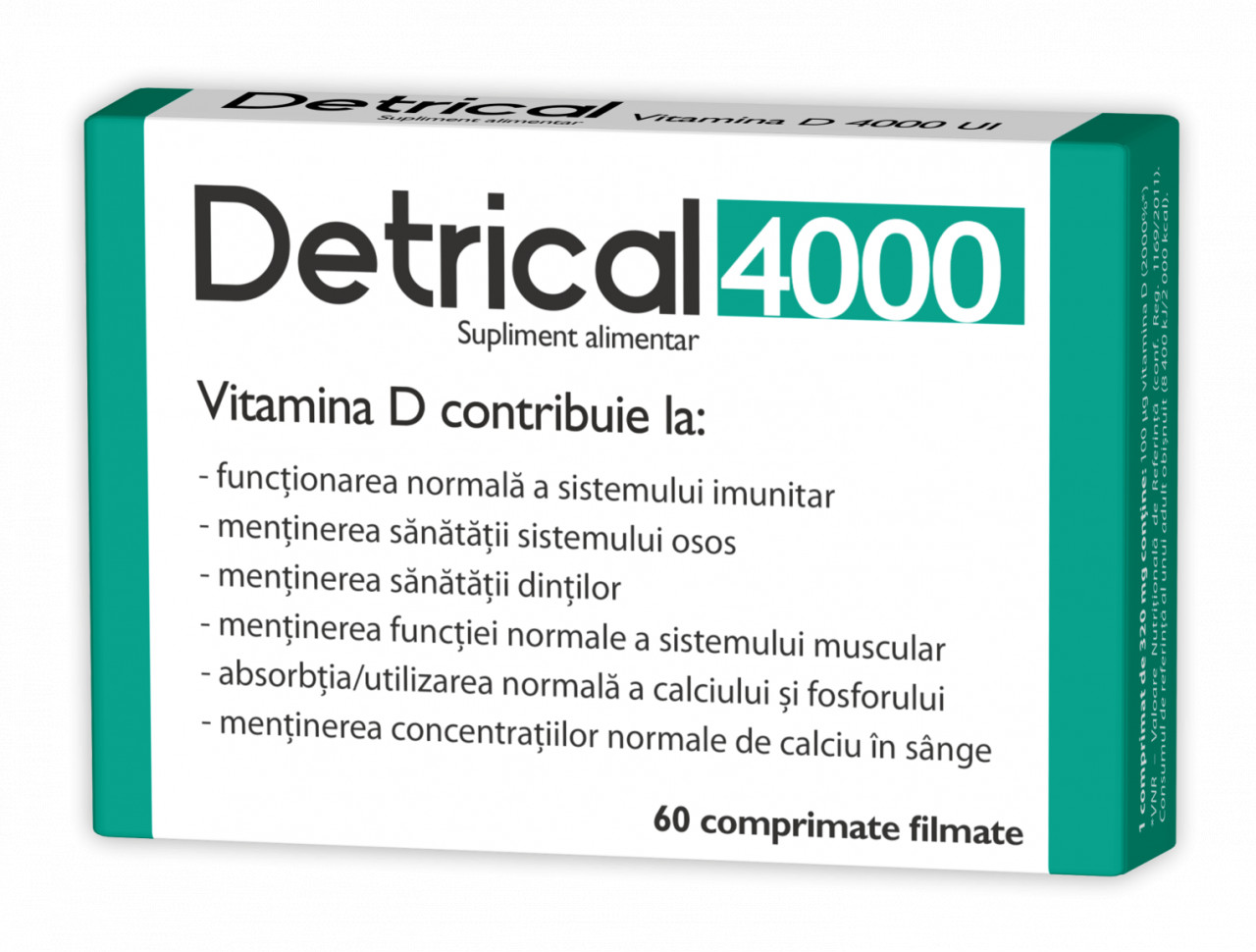 Detrical Vitamina D 4000 UI Vitamina D,”vitamina soarelui”, este o vitamina liposolubila cu rol important in formarea scheletului nostru, mai ales in faza de crestere, asigurand transportul calciului si fosforului in zonele corpului care au nevoie de ele pentru a sprijini remineralizarea oaselor la varsta adulta, permitand absorbtia acestor minerale in intestin, apoi transportul calciului in s