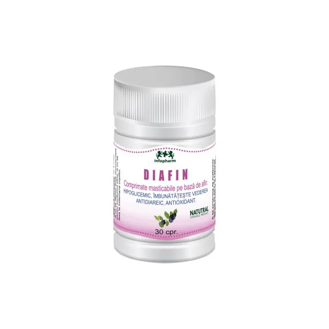 Diafin, 30 comprimate masticabile, Infopharm Este un supliment alimentar 100% natural. Intareste imunitatea, hipoglicemic – stimuleaza refacerea celulelor beta (pancreas), regleaza tranzitul intestinal, circulatia capilara, mareste acuitatea vizuala, prevenirea si tratarea diareelor specifice. Compoziție: extract concentrat de afine, glucoza, lactoza, talc, stearat de magneziu, amidon. Efecte: Afinele sunt bogate in antioxidanti, vitamina C, vitamine din complexul B, vitamina E, vitamina A, cupru (care intareste imunitatea si are rol antibacterian), seleniu, zinc, fier (promoveaza imunitatea prin cresterea hemoglobinei si a concentratiei de oxigen din sange) si stimuleaza astfel, sistemul imunitar si previne aparitia infectiilor. Neutralizeaza radicalii liberi care pot promova boala si imbatranirea in organism. Ajuta la mentinerea sanatatii tractului urinar. Acestea contin un compus format din polimeri mari, precum moleculele grele, care inhiba cresterea bacteriilor respective. Afinele au proprietati antibiotice, care se adauga la acest efect. Moleculele mari si grele spala practic aceste bacterii de pe peretii tractului urinar, prevenind declansarea infectiei. Pastreaza integritatea vederii: extractul de afine contine un nivel ridicat de compusi numiti antocianozide, care s-a dovedit in urma studiilor clinice ca incetinesc pierderea vederii. Acesti compusi pot preveni sau intarzia toate problemele legate de imbatranire, cum ar fi degenerescenta maculara, cataracta, miopia si hipermetropia, uscaciunea ochilor si infectiile, in special cele de la nivelul retinei, datorita propietatilor lor antioxidative. Mentin sanatatea creierului si scad riscul dezvoltarii bolilor de inima. Lupta impotriva cancerului. Afinele s-au dovedit a fi de ajutor bolnavilor de cancer, deoarece contin anumiti compusi, cum ar fi pterostilbene (excelent in remediul cancerului de colon si ficat) si acid aleagic, care in combinatie cu antocianina si alti antioxidanti precum vitamina C si cupru, pot duce la prevenirea sau vindecarea cancerului. Ingrediente: Vitamina A IU 79.92 IU; Vitamin A RAE 4.00 RAE; A – carotenoid 7.99 RE; A – retinol 0.00 RE; A – beta caroten 47.36 mcg; Tiamina – B1 0.05 mg; Riboflavina – B2 0.06 mg; Niacina – B3 0.62 mg 3.10; Niacina – echivalent 0.69 mg; Vitamina B6 0.08 mg; Vitamina B12 0.00 mcg; Biotina – mcg –; Vitamina C 14.36 mg; Vitamina D IU 0.00 IU; Vitamina D mcg; Vitamina E alfa – echivalent 0.84 mg; Vitamina E IU – IU; Vitamina E mg – mg ; Folat 8.88 mcg 2.22; Vitamina K 28.56 mcg 35.70; Acid pantotenic 0.18 mg 1.80. Minerale; Bor – mcg ; Calciu 8.88 mg 0.89; Cloruri – mg ; Crom – mcg-; Cupru 0.08 mg 4.00; Fluoruri mg ; Iod – mcg-; Fier 0.41 mg 2.28; Magneziu 8.88 mg 2.22; Mangan 0.50 mg 25.00; Molibden mcg ; Fosfor 17.76 mg 1.78; Potasiu 113.96 mg 3.26; Seleniu 0.15 mcg 0.21; Sodiu 1.48 mg 0.06; Zinc 0.24 mg 1.60. Mod de folosire: La copii sugari: 1-2 comprimate zi in putin ceai; La adulti: 3-6 comprimate pe zi timp de 25 zile pe luna. Poate fi folosit si fara limita de durata. Prezentare: 30 comprimate