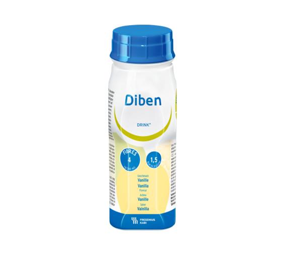 Diben Drink Vanilie, 4 x 200ml Descriere: Diben Drink Vanilie este un aliment dietetic destinat unor scopuri medicale speciale, având o concentrație calorică de 1,5 kcal/ml. Este disponibil în ambalaje de carton cu 4 flacoane de plastic Easy Bottle de 200ml fiecare. Indicații: Aliment dietetic pentru nutriția enterală, recomandat în special pentru pacienții cu diabet zaharat sau intoleran