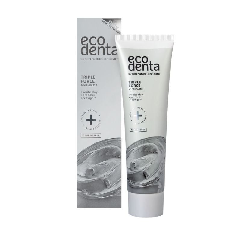 Protejati-va dintii printr-o curatare regulata, folosind o pasta de dinti de calitate!Pastele de dinti oferite de brandul Ecodenta fabricate din ingrediente naturale, sanatoase si ecologice. Pastele nu contin ingrediente spumante sau abrazive, peroxid, SLS sau parabeni.Pasta de dinti cu triplu efect cu argila alba, propolis si TeavigoTM combina ingredientele necesare pentru ingrijirea eficienta a zonelor cele mai sensibile. Argila alba ajuta la restabilirea mineralelor din smaltul dintilor. Propolisul reduce sangerarea gingiilor si sensibilitatea si este potrivit pentru profilaxia paradontozei.Ingredientul inovator TeavigoTM previne formarea placii si ofera o senzatie de prospetime de lunga durata.