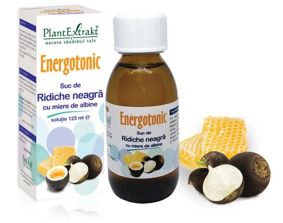 + Livrare gratuităEnergotonic Suc de ridiche neagra cu miere de albine, 125 ml Descriere generala Energotonic Suc de ridiche neagra cu miere de albine este un supliment natural cu efect calmant asupra cailor respiratorii. Recomandat in caz de tuse productiva si raguseala, ajuta la fluidificarea secretiilor si la expectorarea acestora, sustinand sanatatea aparatului respirator. Compozitie activa Suc de Ridiche neagr