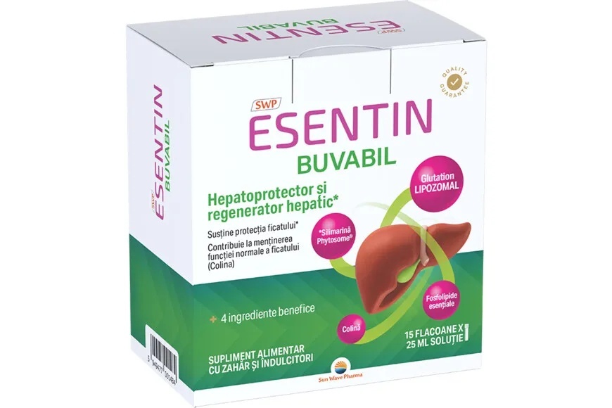 Esentin Buvabil 25ml, 15 flacoane, Sun Wave Esentin Buvabil este un supliment alimentar hepatoprotector, formulat pentru susținerea sănătății ficatului și regenerării celulare. Produsul combină glutation lipozomal, silimarina Phytosome, fosfolipide esențiale și colină, pentru o acțiune sinergică de protecție, detoxifiere și refacere a celulelor hepatice. Glutationul lipozomal, principalul antioxidant endogen, contribuie la protecția împotriva stresului oxidativ și poate sprijini regenerarea hepatocitelor. Silimarina Phytosome® asigură o biodisponibilitate optimizată, iar fosfolipidele esențiale și colina contribuie la menținerea structurii membranelor celulare și metabolismului normal al lipidelor. Proprietăți și beneficii Conține glutation lipozomal, cu potențial antioxidant și protecție la nivel celular Silimarina Phytosome poate sprijini funcția hepatică și detoxifierea naturală Fosfolipidele esențiale și colina pot contribui la menținerea structurii și funcției normale a membranelor hepatice Formulă sinergică care poate susține metabolismul normal al lipidelor și regenerarea celulară Potrivit pentru adulți Suplimentele alimentare nu înlocuiesc o dietă variată și echilibrată și un stil de viață sănătos. Mod de administrare Adulți: conform recomandării specialistului A se consuma cu prudenta persoanelor cu afecțiuni hepatice grave sau care urmează tratamente medicamentoase. Compoziție per flacon Ingredient Cantitate Fosfolipide esențiale 500 mg Glutation (lipozomal) 300 mg Colina 250 mg Silimarina Phytosome 250 mg Ingrediente complete: Apă; stabilizator: glicerol; fructoză; fosfolipide esențiale (3,39%); colină bitartrat (2,23%); glutation lipozomal (1,57%) (glutation, lecitina din floarea-soarelui); silimarina Phytosome® (0,91%) (emulsifiant: lecitina din soia, extract uscat din fructe de Armurariu – Silybum marianum, 15-20% silimarina); aromă de fructul pasiunii; agent de îngroșare: gumă xantan; conservanți: sorbat de potasiu, benzoat de sodiu; îndulcitori: sucraloză, glicozide steviolice din Stevia. Precauții A nu se depăși doza recomandată pentru consumul zilnic Suplimentele alimentare nu înlocuiesc o dietă variată și echilibrată A nu se lăsa la îndemâna copiilor Consultați medicul înainte de utilizare dacă sunteți gravidă, alăptați sau aveți afecțiuni hepatice Prezentare 15 flacoane x 25ml