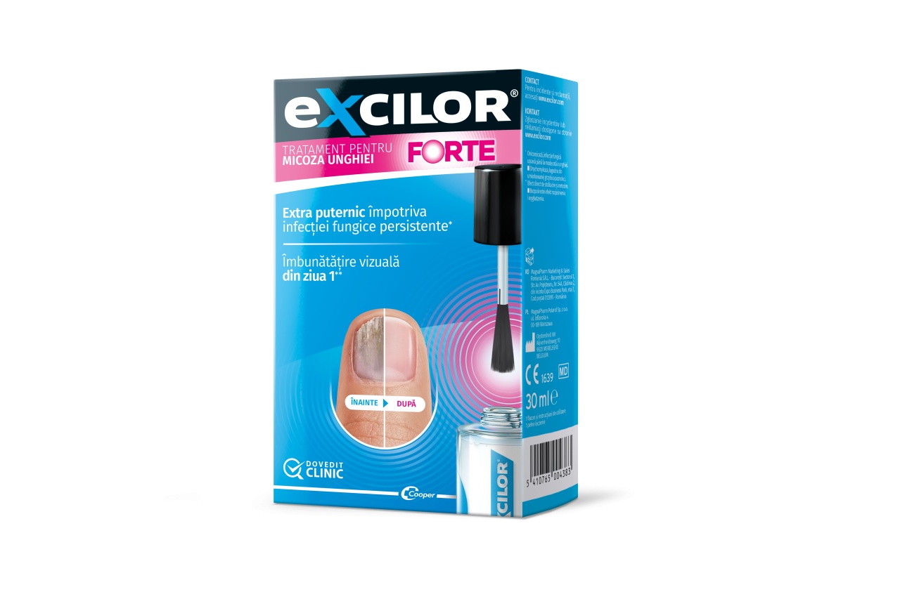 Excilor Forte pentru infectia fungica a unghiei, 30 ml, Excilor Proprietati: – cel mai important component al unghiilor de la maini si de la picioare este cheratina; o substantă tare si densă pe care majoritatea preparatelor antifungice nu o pot penetra; – in cele mai multe cazuri, ciupercile cresc sub unghie, ceea ce le face dificil de tratat; – controlează micromediul unghiei prin acidificarea patului unghial; – contine substante acide care sunt capabile să penetreze unghia si să permită tratarea din interior spre exterior; – de obicei, durează cateva luni pană cand o unghie afectată arată din nou complet sănătoasă; – in medie, o unghie de la picior creste cu 1,5 mm intr-o lună. Excilor® FORTE scade imediat pH-ul unghiei, creand un mediu ostil pentru dezvoltarea fungilor; – cu toate acestea, unghia deteriorată are nevoie de timp pentru a creste. Mod de utilizare: Excilor® FORTE trebuie aplicat o dată pe zi, preferabil după dus. Inainte de aplicare, curătati unghia si indepărtati orice strat vechi de lac de unghii. Agitati bine flaconul inainte de utilizare. In continuare, folositi pensula pentru a acoperi intreaga suprafată a unghiei. Asigurati-vă că aplicati un strat suficient de Excilor® FORTE. Flaconul poate contine aglomerări formate din reziduuri de film uscat. Stergeti eventualele aglomerări de film uscat de pe pensulă. Acest lucru este normal si este cauzat de uscarea datorită contactului cu aerul. Nu are nicio influentă asupra performantei sau calitătii produsului. Lăsati unghia să se usuce. Acest lucru durează intre 3 si 5 minute. Produsul este alb la aplicare, dar pe măsură ce se usucă devine transparent si veti remarca un strat elastic ce se va reduce cu timpul. Pentru efect optim este recomandat să asteptati pană la 5 minute inainte de a vă pune sosete si/sau pantofi. După aplicare, este normal să simţiţi o senzaţie de furnicături sub unghie si acest lucru arată că produsul penetrează unghia. Ingrediente: Apă, poliuretan, ulei de mentă, acid acetic, sesquioleat de sorbitan, hexandiol, octandiol, alcool benzilic, galat de octil, alcool lanolinic etoxilat si acetilat, alcool fenetilic, butilcarbamat de iodopropinil, gumă xantan, acid dehidroacetic, etilhexilglicerină, biotină. Precautii: Doar pentru uz extern. Nu utilizati dacă aveti o hipersensibilitate sau alergie cunoscută la oricare dintre ingrediente. Aplicati numai pe unghie, evitati contactul cu pielea din jur. Evitati contactul cu ochii si mucoasele. Dacă produsul intră in contact cu ochii sau mucoasele, clătiti bine cu apă. Nu sunt disponibile date clinice privind utilizarea produsului de către copii sau de către femeile insărcinate sau care alăptează. Diabeticii cu probleme la nivelul picioarelor trebuie să isi consulte medicul atunci cand incep să utilizeze Excilor® FORTE. Nu utilizati produsul după data de expirare. Prezentare: 30 ml