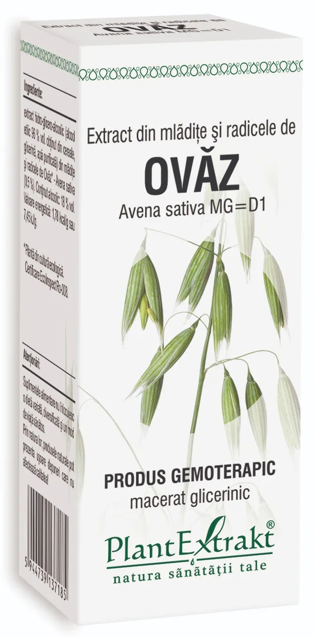 Extract din mladite si radicele de ovaz, 50ml, PlantExtrakt Proprietăți: Extractul gemoterapic este obținut din mlădițe și rădicele de Ovăz (plăntuța tânără din cultură organică), prelucrate conform rețetei farmaceutice de macerat glicerinic. Conține alcool etilic 18% vol. Actiune: Sistem nervos central: ajută la fortifierea organismului în stări de astenie fizică și psihică, în convalescență după răceli. Calmant în stări de stres și agitație. Tiroidă: susține funcția normală a tiroidei și producția de hormoni tiroidieni. Aparat digestiv: susține buna funcționare a tractului digestiv, procesele de detoxifiere de la acest nivel și secreția glandelor anexe (ficat, pancreas). Oase: demineralizări osoase. Aparat uro-genital: susține sănătatea urogenitală a femeii (acțiune estrogenică). Administrare: Adulți și copii peste 7 ani: în general câte 2 ml, în puțină apă, de 2-3 ori pe zi, înainte de mese. O dată pe zi, în caz de asociere cu alte extracte gemoterapice. Durata utilizăriiȘ 1-3 luni. Se poate repeta, după 1 sau 2 luni de pauză. Prezentare: 50ml