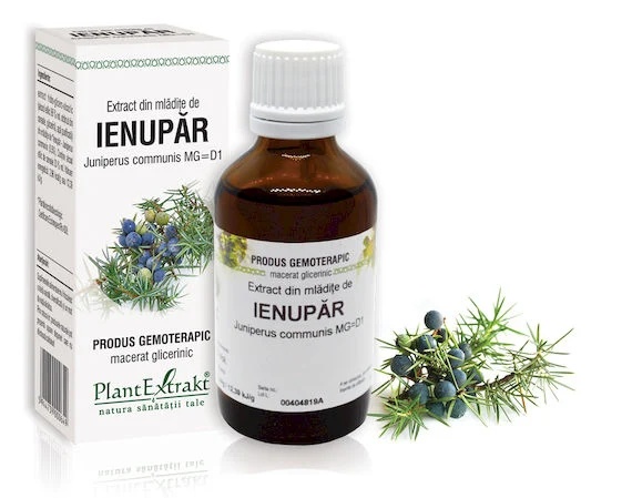 Extract din mlădiţe de Ienupăr – Juniperus communis MG=D1, 50 ml Organotropism: ficat, aparat urinar Susține buna funcționare a ficatului și poate contribui la eliminarea calculilor renali. Niveluri de acţiune: ficat, aparat urinar, aparat osteoarticular, tract gastro-intestinal, sistem vascular, metabolism general Recomandari principale: Ficat: susține funcția de detoxifiere a ficatului Aparat excretor: sprijină funcțiile rinichilor și ajută la eliminarea calculilor oxalo-calcici Propuneri de asocieri cu alte produse gemoterapice: În afectări hepatice cu scăderea numărului de trombocite: cu Extract din muguri de Carpen – Carpinus betulus MG=D1 Mod de administrare: Adulţi şi copii peste 7 ani: 2 ml, în puţină apă, de 2 ori pe zi, înainte de mese În caz de asociere cu alte gemopreparate: 3 ml, în puţină apă, o dată pe zi, dimineaţa Ca drenor hepato-renal: 2 ml, în puţină apă, de 3 ori pe zi, înainte de mese 1 ml ≈ 25 picături Durata administrării poate varia între 1-3 luni și se poate repeta după 1-2 luni de pauză Atenţionări: Contraindicat femeilor însărcinate și celor care alăptează