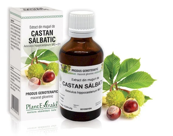 Extract din muguri de Castan salbatic – Aesculus hippocastanum MG=D1, 50 ml Organotropism: sistem circulator venos Sustine sanatatea venelor, capilarelor si reduce congestia venoasa. Nivele de actiune: sistem venos, aparat respirator Descriere: Extractul gemoterapic este obtinut din muguri proaspeti de Castan salbatic (Aesculus hippocastanum), prelucrati conform retetei farmaceutice de macerat glicerinic. Contine alcool etilic de cereale 33% vol. Produsul sprijina sanatatea venelor si capilarelor, fiind util in varice, hemoroizi si staza venoasa, ajutand la mentinerea unei circulatii periferice sanatoase. Recomandari principale: Sistem circulator: sustine sanatatea venelor in caz de varice, hemoroizi, staza si congestie venoasa Capilare: reduce fragilitatea capilara si imbunatateste rezistenta vasculara Propuneri de asocieri cu alte produse gemoterapice: Afectari ale circulatiei venoase: cu Extract din muguri de Castan comestibil – Castanea vesca MG=D1 Hemoroizi si hipertensiune venoasa, in special la femei: cu Extract din muguri de Scorus – Sorbus domestica MG=D1 Modul de administrare: Adulti: 4–6 ml in putina apa, de 2 ori pe zi, inainte de mese 1 ml = aproximativ 25 de picaturi In asociere cu alte extracte gemoterapice: 1 doza pe zi Durata administrarii: 1–3 luni, cu posibilitate de repetare dupa 1–2 luni de pauza Reactii adverse si contraindicatii: Nu se cunosc reactii adverse sau contraindicatii