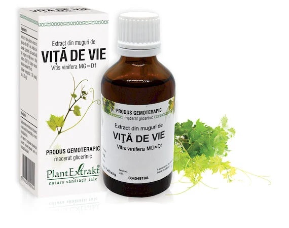 Extract din muguri de Vita de vie – Vitis vinifera MG=D1, 50 ml Descriere: Extractul din muguri de Vita de vie (Vitis vinifera MG=D1) este un gemoterapic natural cu actiune benefica asupra articulatiilor si cailor respiratorii. Produsul contribuie la reducerea disconfortului osteoarticular si la sustinerea sistemului de aparare al organismului, fiind util in afectiuni ale tractului respirator. Compozitie: Extract din muguri de Vita de vie (Vitis vinifera MG=D1) Alcool etilic de cereale, conform retetei farmaceutice de macerat glicerinic Recomandari: Ameliorarea durerilor articulare Sustinerea cailor respiratorii si stimularea imunitatii naturale Asocieri recomandate: In afectari osteoarticulare: cu Extract din muguri de Coacaz negru si Extract din muguri de Jneapan In afectari ale amigdalelor si faringelui: cu Extract din muguri de Nuc Mod de administrare: Adulti si copii peste 7 ani: 2 ml in putina apa, de 2–3 ori pe zi, inainte de mese Copii 2–7 ani: 1 ml in putina apa, de 2–3 ori pe zi, inainte de mese In combinatie cu alte extracte gemoterapice: 1 administrare pe zi 1 ml = aprox. 25 picaturi Durata: 1–3 luni, cu posibilitatea de repetare dupa 1–2 luni de pauza Reactii adverse si contraindicatii: Nu se cunosc reactii adverse sau contraindicatii. Mod de prezentare: Flacon de 50 ml.