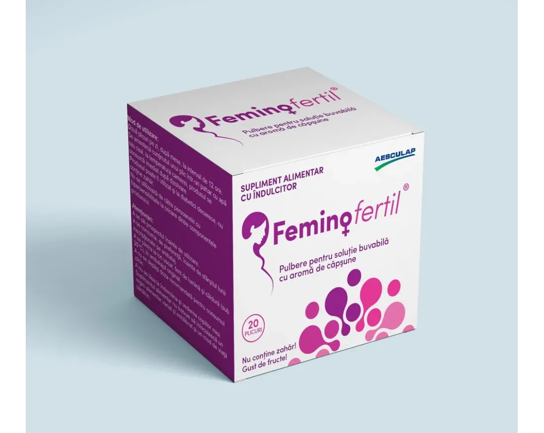 Feminofertil, 20 plicuri – Aesculap Feminofertil este un supliment alimentar cu o formula complexa, ce combina mio-inozitol, D-chiro-inozitol, N-acetilcisteina (NAC), alfa-lactoalbumina si Quatrefolic® , o forma activa de folat. Produsul este conceput pentru sustinerea fertilitatii, echilibrului hormonal si functionarii normale a ciclului menstrual. Formula contine ingrediente care actioneaza sinergic pentru sustinerea ovulatiei, a metabolismului glucozei si a dezvoltarii ovocitelor. Beneficii principale Sustine fertilitatea si echilibrul hormonal Contribuie la normalizarea ovulatiei Sprijina dezvoltarea ovocitelor Sustine metabolismul glucozei Contribuie la reducerea oboselii si extenuarii Sustine functionarea normala a sistemului imunitar Ingrediente active (per plic) Mio-inozitol – 2000 mg N-acetil-L-cisteina (NAC) – 200 mg D-chiro-inozitol – 50 mg Alfa-lactoalbumina – 50 mg Quatrefolic® (L-metilfolat) – 0,3448 mg Alte ingrediente: aroma identic naturala de capsune, indulcitor natural din extract de stevia. Rolul ingredientelor Mio-inozitol – component al lichidului folicular, implicat in dezvoltarea ovocitelor si ovulatie D-chiro-inozitol – sustine metabolismul glucozei si echilibrul hormonal N-acetilcisteina (NAC) – antioxidant, sustine echilibrul hormonal si ciclul menstrual Alfa-lactoalbumina – creste biodisponibilitatea mio-inozitolului Quatrefolic® – forma activa de folat, cu biodisponibilitate imediata Mod de administrare 2 plicuri pe zi, dupa mese Se dizolva continutul unui plic intr-un pahar cu apa sau ceai la temperatura camerei Se consuma imediat dupa dizolvare Produsul poate fi utilizat si de persoanele cu diabet, deoarece nu contine zahar. Atentionari A nu se depasi doza zilnica recomandata Suplimentele alimentare nu inlocuiesc o dieta variata si un stil de viata sanatos Contraindicat persoanelor alergice la oricare dintre ingrediente A nu se lasa la indemana copiilor La dozele recomandate, produsul nu are efecte secundare cunoscute. Prezentare Cutie cu 20 plicuri