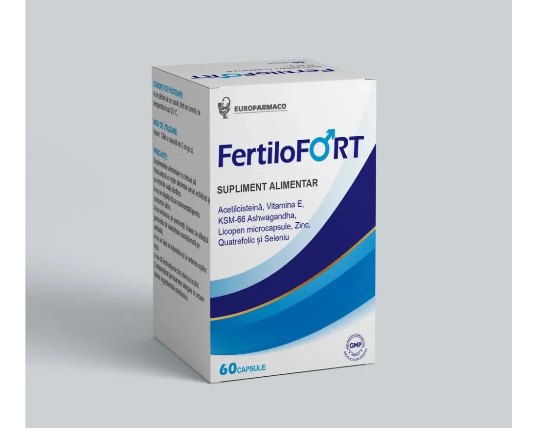 Fertilofort, 60 capsule Fertilofort este un supliment alimentar conceput pentru sustinerea fertilitatii masculine, cu o formula complexa ce contine 7 ingrediente active : acetilcisteina, vitamina E, ashwagandha KSM-66, licopen, zinc, folat si seleniu. Ingredientele sunt combinate in doze optime pentru a actiona sinergic asupra parametrilor esentiali ai fertilitatii masculine, precum calitatea, motilitatea si morfologia spermatozoizilor. Beneficii principale Sustine fertilitatea si functia reproductiva masculina Contribuie la mentinerea concentratiilor normale de testosteron Sustine calitatea, motilitatea si morfologia spermatozoizilor Protejeaza celulele impotriva stresului oxidativ Sustine sanatatea prostatei Recomandat in perioadele de pregatire pentru conceptie Ingrediente active (per capsula) N-acetil-L-cisteina (NAC) – 300 mg Vitamina E – 65 mg Extract de ashwagandha KSM-66 – 75 mg Licopen microcapsulat – 40 mg Zinc – 1,8 mg Acid folic (Quatrefolic®) – 400 mcg Seleniu (L-selenometionina) – 55 mcg Rolul ingredientelor N-acetilcisteina (NAC) – antioxidant, sustine calitatea si motilitatea spermei Ashwagandha KSM-66 – adaptogen ce poate sustine nivelul de testosteron si vitalitatea Licopen – antioxidant ce protejeaza ADN-ul spermatozoizilor Zinc – contribuie la fertilitate si mentinerea testosteronului normal Seleniu – esential pentru spermatogeneza si motilitatea spermatozoizilor Vitamina E – protejeaza celulele impotriva stresului oxidativ Folat – sustine sinteza proteinelor si functia reproductiva Mod de administrare 1 capsula de 2 ori pe zi Pentru efecte optime, se recomanda administrarea timp de cel putin 3 luni , sau conform recomandarii specialistului. Atentionari A nu se depasi doza zilnica recomandata Suplimentele alimentare nu inlocuiesc o dieta variata si un stil de viata sanatos Contraindicat persoanelor alergice la oricare dintre ingrediente A nu se lasa la indemana copiilor La dozele recomandate, produsul nu are efecte secundare cunoscute. Prezentare Cutie cu 60 capsule