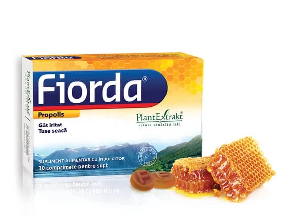Fiorda Propolis, 30 capsule Descriere generala Fiorda Propolis este un supliment natural conceput pentru protejarea mucoasei gatului si ameliorarea senzatiei de gat iritat si tuse seaca. Combina efectul calmant al lichenului de piatra islandez cu proprietatile antimicrobiene ale propolisului si beneficiile nutritive ale mierii si macesei. Produsul sustine sistemul imunitar si ofera un efect placut asupra cavitatii bucale. Compozitie activa Extract de Lichen-de-piatra-islandez – 100 mg Miere de albine – 60 mg Extract de propolis – 50 mg Extract de Macese – 15 mg Extract de Nalba-de-gradina – 15 mg Beneficii principale Protejeaza si mentine hidratata mucoasa gatului Amelioreaza iritatia si tusea seaca Sustine sistemul imunitar Efect calmant si placut asupra cavitatii bucale Mod de utilizare 1-6 comprimate pe zi Comprimatul se mentine in gura pana la dizolvare Nu se consuma mancare sau bautura cel putin 30 de minute dupa dizolvare Atentionari A nu se utiliza in caz de hipersensibilitate la oricare dintre ingrediente Ingerarea unei cantitati mai mari poate avea efect laxativ Contraindicat persoanelor cu intoleranta la fructoza sau alergice la produsele apicole Se consuma cu prudenta de catre diabetici Poate fi utilizat de femeile insarcinate sau care alapteaza doar cu avizul specialistului