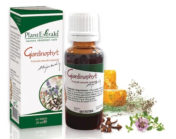 Giardinophyt, 30 ml Sanatatea sistemului digestiv Giardinophyt este un supliment natural recomandat pentru eliminarea parazitilor intestinali. Formula sa are actiune antihelmintica, antimicrobiana si carminativa, contribuind la reducerea disconfortului abdominal, eliminarea gazelor si prevenirea recidivelor. Compozitie Extract de propolis Cimbru (Thymus vulgaris) Seminte de marar (Anethum graveole