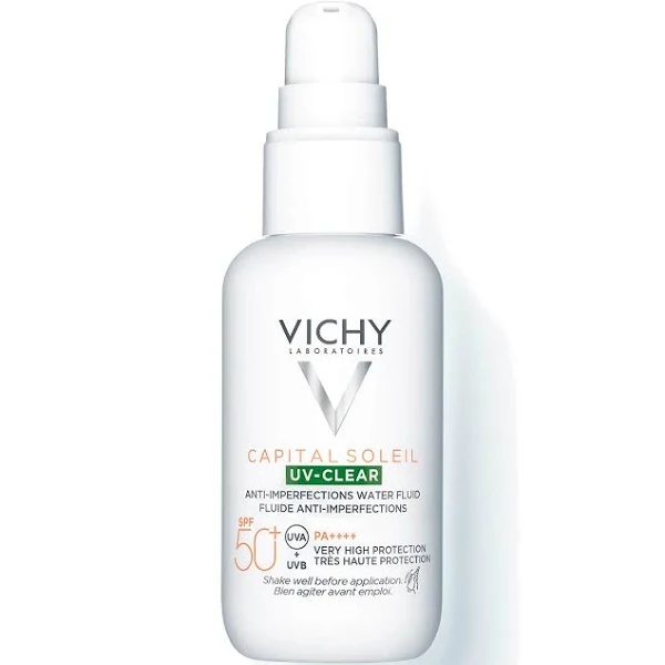 Fluid cu protectie solara pentru fata UV Clear Capital Soleil SPF50+, 40ml, Vichy Formula ultra-lejera imbogatita cu acid salicilic si niacinamida pentru a reduce imperfectiunile. Proprietati: radiatile UV zilnice pot agrava aspectul lucios, imperfectiunile si semnele post-acneice; UV-CLEAR este dezvoltat cu ajutorul tehnologiei patentate Netlock ce ofera o protectie avansata UVA, UVB, SPF 50+; formula sa ultra-lejera este imbogatita cu acid salicilic si niacinamida pentru a reduce imperfectiunile; senzorialitate de neegalat: formula ultra-lejera, neuleios, non-gras si nelipicios, fara urme albe; potrivit pentru pesoanele care au tenul mixt pana la gras; dezvoltat cu ajutorul tehnologiei multi-patentate NETLOCK: acid salicilic, niacinamida. Mod de utilizare: Aplica produsul in fiecare zi ca ultim pas in rutina ta de ingrijire a pielii: Pasul 1: Ia 5-6 pompite de produs. Pasul 2: Aplica-le pe fata, cu miscari circulare. Pasul 3: Uniformizeaza in jurul ochilor si in zona gatului. Ingrediente: aqua /water – alcohol denat. – diisopropyl sebacate – silica – isopropyl myristate – ethylhexyl salicylate – ethylhexyl triazone – bis-ethylhexyloxyphenol methoxyphenyl triazine – butyl methoxydibenzoylmethane – glycerin – ci 77891 / titanium dioxide – propanediol – c12-22 – alkyl acrylate/hydroxyethylacrylate copolymer – niacinamide – drometrizole trisiloxane – perlite – tocopherol – caprylic/capric triglyceride – terephthalylidene dicamphor sulfonic acid – ci 77492 / iron oxides – caprylyl glycol – pentylene – glycol – triethanolamine – hydrolyzed rice protein – ci 77491 / iron oxides – trisodium ethylenediamine – disuccinate – silica silylate – acrylates / c10-30 – alkyl acrylate crosspolymer – butylene glycol – ci 77499 / iron oxides – hydroxyethylcellulose – vitreoscilla ferment – disodium edta – parfum / – fragrance. Prezentare: 40ml