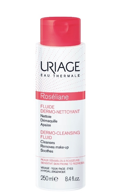 Fluid demachiant Roseliane, 250 ml, Uriage Fluid demachiant hipoalergenic pentru piele sensibilă, hiper-reactivă, cu roșeață difuză și cu tendința cuperozică. Curată și demachiază, descongestionează, reîmprospătează și calmează roșeața, asigurând pielii un confort de durată. Compoziție: Apa Termală Uriage, agenți delicați de curățare, ingrediente hidratante. Fără săpun, fără parabeni. Produs hipoalergenic. Produs testat oftalmologic. Indicații: Igiena pielii predispuse la roșeață, cuperozică. Utilizare: Se aplică pe un disc demachiant și se curăță fata și ochii. Nu necesită clătire. Prezentare: 250 ml