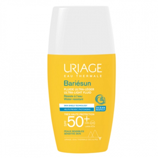 Fluid ultra lejer pentru protectie solara Bariesun SPF50+, 30ml, Uriage Proprietati: Complex de filtrare a luminii albastre și anti-UVA-UVB — Brevet [BARIESUN] – Brevet [TELOMERES PROTECT] — Apă termală Uriage — Vitamina E — Aquaspongine — Neparfumat — Finisaj invizibil — Nelipicios — Necomedogen – Testat dermatologic Complex de filtre de înaltă performanță și două brevete dermatologice pentru a proteja pielea, a preveni deteriorarea celulară și foto-îmbătrânirea indusă de UVA, UVB și lumina albastră. Acest fluid de protecție solară foarte ridicată asigură o absorbție rapidă și un finisaj uscat, fără urme albe. Dimensiunea sa de buzunar îl face foarte practic de folosit cu orice ocazie! Mod de utilizare: Aplicați o doză suficientă de produs înainte de expunere. Reaplicați frecvent, mai ales după transpirație, înot sau ștergere cu prosopul. Chiar și atunci când sunteți bine protejat, reduceți cât mai mult posibil expunerea la soare. Nu expuneți bebelușii și copiii mici direct la soare. Agitați bine înainte de folosire. Ingrediente: AQUA (WATER, EAU) — DICAPRYLYL CARBONATE — HEPTYL UNDECYLENATE — METHYLENE BIS-BENZOTRIAZOLYL TETRAMETHYLBUTYLPHENOL[NANO] — ETHYLHEXYL TRIAZONE — BUTYL METHOXYDIBENZOYLMETHANE — PEG-30 DIPOLYHYDROXYSTEARATE — DIMETHICONE — SILICA — BIS-ETHYLHEXYLOXYPHENOL METHOXYPHENYL TRIAZINE — PEG-45/DODECYL GLYCOL COPOLYMER — SODIUM CHLORIDE — DECYL GLUCOSIDE — MAGNESIUM SULFATE — GLYCERIN — GLUCOSE — GLYCERYL BEHENATE — BENZOIC ACID — TETRASODIUM EDTA — SUCCINOGLYCAN — HYDROGENATED POLYDECENE — TOCOPHERYL ACETATE — TREHALOSE — CITRIC ACID — PROPYLENE GLYCOL — XANTHAN GUM — ASCORBYL TETRAISOPALMITATE — TOCOPHEROL — SPIRULINA PLATENSIS EXTRACT — POLYQUATERNIUM-51 Precautii: Evitați contactul cu ochii. Prezentare: 30ml