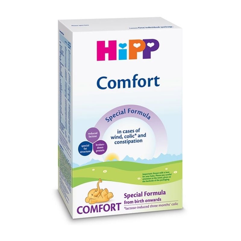 HiPP Comfort Formulă de lapte specială, de la naștere (+0 luni), este creată pentru burticile sensibile, ajutând la reducerea flatulenței, colicilor și constipației. Cu o compoziție unică ce include grăsimi cu structură specială și fibre prebiotice, această formulă reglează digestia și înmoaie scaunul copilului. Se utilizează doar sub supraveghere medicală.