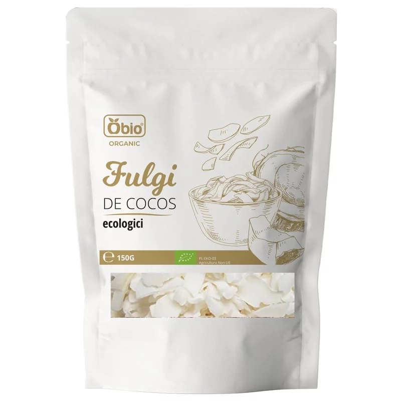 Fulgi de cocos raw bio, 150g, OBio Fulgi de cocos bio, cruzi (raw), fara sulfiti. Ingrediente: fulgi din nuca de cocos*. *din agricultura ecologica Valori nutritionale/100g: Energie: 2290 kj / 547 kcal, Grasimi: 54g din care acizi grasi saturati: 47g, Glucide: 20g din care zaharuri: 6,1g, Proteine: 5,7g, Fibre: 13g, Sare: 0,05g Alergeni: produsul poate contine urme de soia, nuci, gluten. Produs certificat ecologic. Tara de origine: Sri Lanka Prezentare: 150g