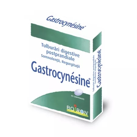 Gastrocynesine este utilizat pentru medicament homeopatic utilizat în tratamentul simptomatic al tulburărilor digestive postprandiale uşoare: senzație de greutate stomacală, somnolență, regurgitații. Contraindicatii: Hipersensibilitate la substanțele active sau la oricare dintre excipienți. Precautii: Înainte să luați Gastrocynesine, adresaţi-vă medicului dumneavoastră sau farmacistului. Sarcina, alăptarea şi fertilitatea: Medicamentul se poate administra în timpul sarcinii și alăptării. Conducerea vehiculelor şi folosirea utilajelor: Acest medicament nu influențează capacitatea de a conduce vehicule sau de a folosi utilaje. Mod de administrare: Doze și mod de administrare: Adulți și copii: Comprimatele se dizolvă încet în cavitatea bucală: 1 sau 2 comprimate cu 15 minute înaintea meselor. Dacă este necesar, tratamentul se repetă după mese. La copiii cu vârsta sub 6 ani, datorită formei farmaceutice, comprimatul se dizolvăîn apă înainte de administrare. Administrare orală. Dacă aveţi orice întrebări suplimentare cu privire la acest medicament, adresaţi-vă medicului dumneavoastră, farmacistului sau asistentei medicale. Compozitie: Un comprimat de 300 mg conține: Abies nigra 4 CH 75 mg Carbo vegetabilis 4 CH 75 mg Nux vomica 4 CH 75 mg Robinia pseudo acacia 4 CH 75 mg. Excipienți cu efect cunoscut: zahăr 225 mg, lactoză 72 mg. Prezentare: 60 comprimate Atentionare: Citiţi cu atenţie şi în întregime prospectul înainte de a începe să utilizaţi acest medicament deoarece conţine informaţii importante pentru dumneavoastră.