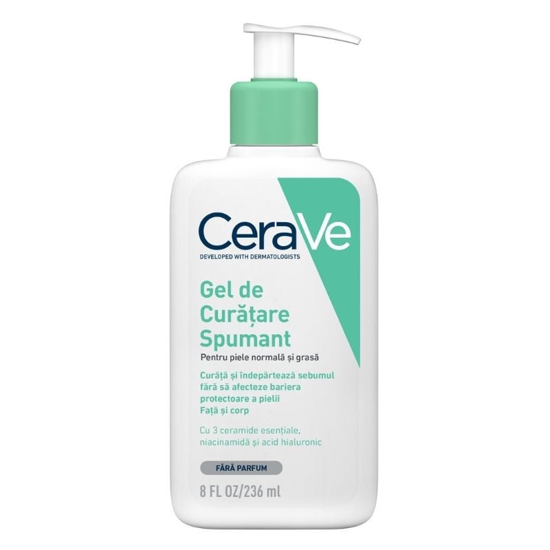 Gelul de Curățare Spumant CeraVe curăță delicat în profunzime și reîmprospătează pielea, în timp ce îndepărtează excesul de sebum, impuritățile și machiajul, fără a afecta bariera cutanată.