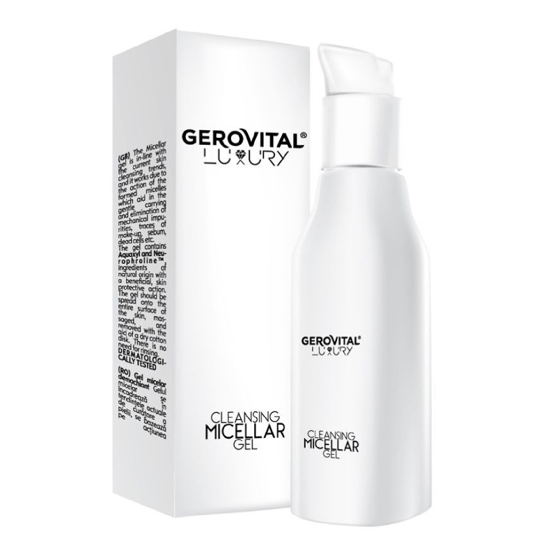 Gerovital Luxury Gel Micelar Demachiant se incadreaza in tendintele actuale de curatare a pielii, se bazeaza pe actiunea micelelor formate, ce ajuta la antrenarea si eliminarea delicata a impuritatilor mecanice, a urmelor de machiaj, a sebumului, a celulelor moarte etc.