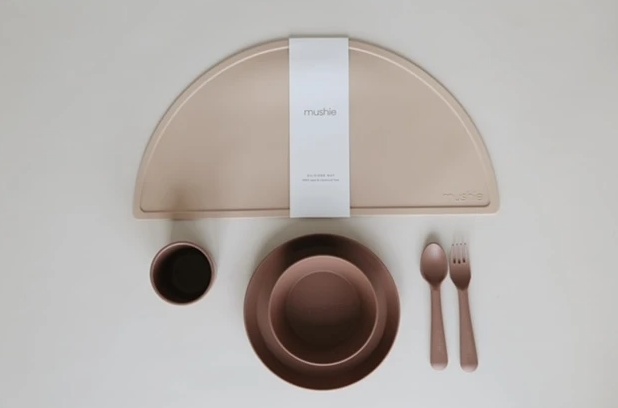 Gift Set Timpul Mesei Blush/Woodchuck, Mushie Surprinde-ti micutul sau micuta cu un cadou special, un gift set perfect pentru timpul mesei. Cu un design elegant si durabil, vesela Mushie , insotita de protectia de masa din silicon Mushie vor fi usor de manuit si de curatat, iar timpul mesei va fi simplu si fara griji. Setul contine: 1 protectie de masa 100% din silicon 1 farfurie 1 bol 1 canita 1 set lingurita + furculita Fiecare piesa este BPA free. Vesela se poate introduce in microunde si poate fi curatata in masina de spalat vase. Protectia pentru masa poate fi de asemenea curatata in masina de spalat vase.