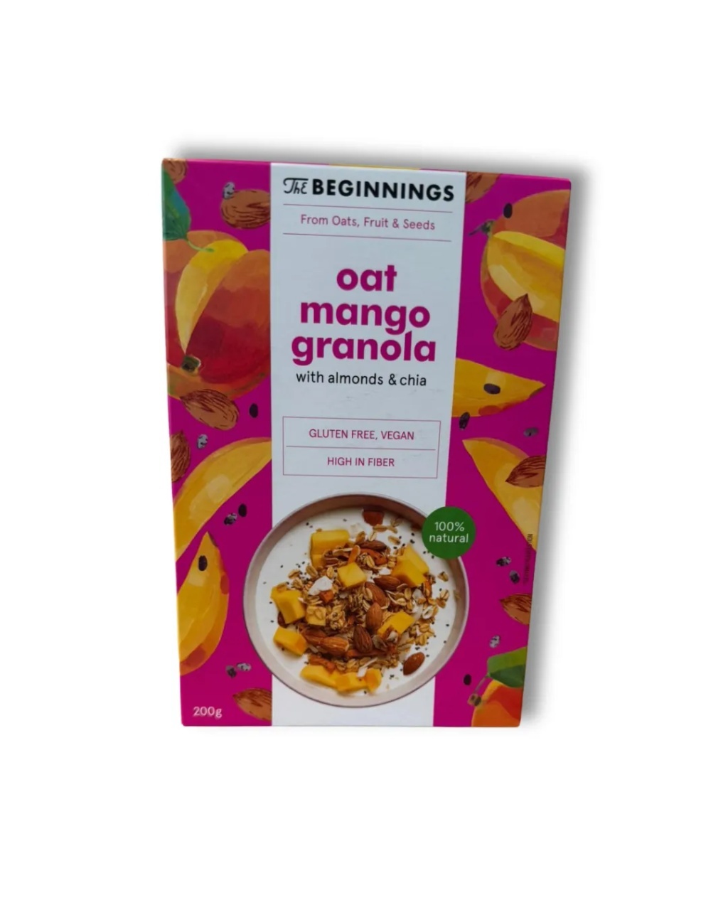Granola cu ovaz si mango, 200g, The Beginnings Granola delicioasa cu ovaz si mango. Aroma exotica a mango-ului liofilizat te va cuceri de la prima degustare. Granola este ideala pentru cei ce adopta un stil de viata sanatos si urmaresc sa consume produse fara zahar, vegane si fara gluten. Ingrediente: fulgi de ovaz fara gluten 50%, sirop de agave, migdale 10%, seminte de chia 9%, ulei de arahide, chipsuri de cocos, mango liofilizat 2%, vanilie Declaratie nutritionala: val. energetica 1879 kJ/ 447 kcal; grasime 25 g din care acizi grasi saturati 9 g; glucide 43 g din care zaharuri 13 g; fibre 12 g; proteine 12 g; sare 0 g. Tara de provenienta: Letonia Prezentare: 200g