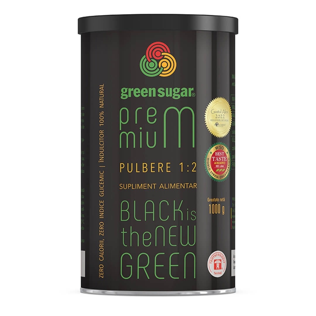 Green Sugar Premium pulbere, 1kg, Remedia Black is the new Green, brandul companiei LABORATOARELE REMEDIA și marcă înregistrată la nivelul Uniunii Europene, este singurul îndulcitor 100% natural, cu ZERO calorii și ZERO indice glicemic, recomandat de medicii nutriționiști și diabetologi ai Societății de Nutriție din România. EXTRACTUL DE STEVIA REBAUDIANA conține Rebaudiozida M, componentă care are un gust foarte apropiat de cel al zahărului şi o putere de îndulcire de până la 300 ori mai mare decât al acestuia, dar fără calorii. Recomandat în curele de slăbire sau în cadrul unei alimentații echilibrate și sănătoase, dar și persoanelor care suferă de diabet, fenilcetonurie, sindrom de colon iritabil și colită de fermentație. Poate fi consumat în perioada sarcinii și alăptării. Mod de utilizare: Se utilizează asemenea zahărului, la prepararea prăjiturilor, torturilor, foietajelor, checurilor, compoturilor, dulcețurilor, înghețatelor, sucurilor sau pentru îndulcirea băuturilor (ceai, cafea), a produselor lactate, a salatelor de fructe. Este stabil la coacere, fierbere sau congelare. Nu fermentează, nu balonează și nu produce carii. Are valoare energetică zero și putere de îndulcire egală cu a zahărului. 1 linguriță Green Sugar Premium 1:2 = 2 lingurițe de zahăr Ingrediente: amestec din Stevia Rebaudiana (Rebaudiozita M) de înaltă puritate (obținut prin tratarea frunzelor de Stevia cu apă fierbinte) – 2% și Eritritol (primul poliol natural obținut din porumb nemodificat genetic, prin fermentaţie cu drojdia Moniella pollinis – proces patentat) – 98%. Valoare energetică: 0 calorii Condiții de depozitare: la temperaturi sub 25°C, ferit de umiditate și lumină. Acest produs nu conține gluten, zahăr, conservanți, coloranți, ingrediente sintetice sau modificate genetic. Prezentare: 1 kg