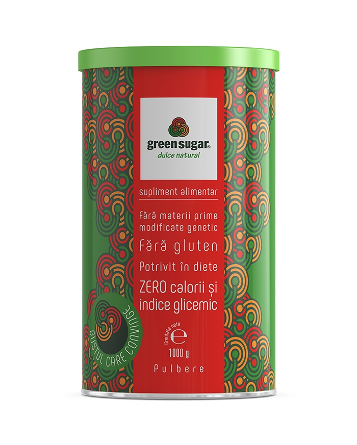 Green Sugar pulbere cutie metalica, 1kg, Remedia Green Sugar este singurul îndulcitor 100% natural, cu ZERO calorii și ZERO indice glicemic, recomandat de medicii nutriționiști și diabetologi ai Societății de Nutriție din România. Recomandare de folosire: Recomandat în curele de slăbire sau în cadrul unei alimentații echilibrate și sănătoase, dar și persoanelor care suferă de diabet, fenilcetonurie, sindrom de colon iritabil și colită de fermentație. Poate fi consumat în perioada sarcinii și alăptării. Ingrediente : amestec din Stevia Rebaudiana de înaltă puritate (obtinut prin tratarea frunzelor de Stevia cu apă fierbinte) și Eritritol (primul poliol natural obținut din porumb nemodificat genetic, prin fermentaţie cu drojdia Moniella pollinis – proces patentat). Acest produs nu conține gluten, zahăr, conservanți, coloranți, ingrediente sintetice sau modificate genetic. Mod de utilizare: Se utilizează asemenea zahărului, la prepararea prăjiturilor, torturilor, foietajelor, checurilor, compoturilor, dulcețurilor, înghețatelor, sucurilor sau pentru îndulcirea băuturilor (ceai, cafea), a produselor lactate, a salatelor de fructe. Este stabil la coacere, fierbere sau congelare. Nu fermentează, nu balonează și nu produce carii. Are valoare energetică zero și putere de îndulcire egală cu a zahărului. Valoare energetică: 0 calorii Prezentare : 1 kg