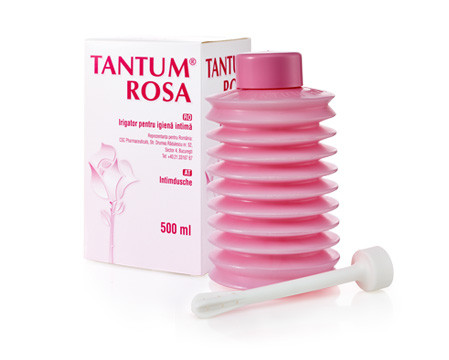 Indicatii: Irigatorul Tantum Rosa a fost conceput pentru spalaturi vaginale. Este sigur, realizat din material plastic moale si flexibil. Irigatorul poate fi refolosit. Se recomanda folosirea irigatorului exclusiv de o singura persoana! Femeile care nu au inceput viata sexuala nu trebuie sa foloseasca irigatorul Tantum Rosa, intrucat utilizarea acestuia poate duce la ruperea membranei himenului. Mod de utilizare: Etapele irigarii: 1. Preparare: Continutul unui plic TANTUM ROSA granule pentru solutie vaginala se dizolva in ½ litru de apa fiarta si racita la temperatura corpului. Umpleti recipientul cu 500 ml (1/2 l) solutie si insurubati canula irigatorului pe recipient. 2. Utilizare Pe cat posibil irigarea ar trebui facuta in pozitie sezand, ideal intr-o cada fara apa (A) – sau in picioare deasupra unei cadite de dus (B). In oricare din cazuri, irigarea trebuie efectuata intr-o pozitie sigura si stabila (ex: utilizati un covoras pentru a evita alunecarea). Irigarea poate fi de asemenea realizata in pozitie sezand pe bideu sau toaleta (C). Introduceti incet canula irigatorului in vagin cat mai adanc posibil. 3. Irigare: Recipientul trebuie tinut cu amandoua mainile, degetele mari trebuie pozitionate in partea superioara a corpului irigatorului, in apropierea canulei. Comprimati burduful irigatorului pentru a elibera solutia. 4. Dupa irigare: Scoateti cu grija canula din vagin, tinand recipientul strans apasat, pentru a nu aspira fluidele vaginale in irigator. 5. Curatare: Desurubati canula de pe recipient. Spalati amandoua partile cu apa calda (pana la 40º C) si lasati-le la uscat. Atentionari: Partile componente ale irigatorului nu se spala la masina! Nu sterilizati! Nu incalziti peste 40º C! Nu utilizati solutii dezinfectante si corozive! Nu utilizati solutii iritante sau tensioactive (detergenti)! Irigatorul este strict pentru uz individual. In cazul unor intrebari privind utilizarea irigatorului, va rugam contactati medicul dumneavoastra ginecolog.
