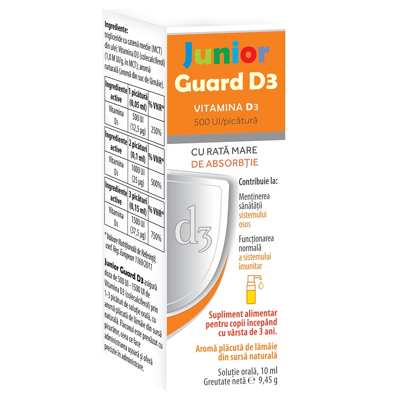 Junior Guard Vitamina D3 500ui, solutie orala, 10ml, MagnaPharm Junior Guard D3 asigură doza de 500 UI – 1500 UI de Vitamina D3 (colecalciferol) prin 1-3 picături de soluție orală cu aromă plăcută de lămâie din sursă naturală. Flaconul este prevăzut cu picurător, ceea ce face administrarea ușoară și oferă precizie în administrare. Ingrediente active per 1 picătură (0,05 ml): Vitamina D3 500 UI (12,5 µg) Ingrediente: – trigliceride cu catenă medie (MCT) din ulei; Vitamina D3 (colecalciferol) (1,0 M UI/g, în MCT); aromă naturală (aromă din suc de lămâie). Mod de administrare: Junior Guard D3 este destinat copiilor, pentru următoarele categorii de vârstă, astfel: – 3-10 ani: 1-2 picături pe zi (500 UI- 1000 UI sau 12,5 µg- 25 µg Vitamina D/ zi) – 11-18 ani: 2-3 picături pe zi (1000 UI- 1500 UI sau 25 µg- 37,5 µg Vitamina D/ zi) Sau în funcție de recomandarea medicului. Produsul se utilizează de preferință în timpul mesei. Se aplică direct în cavitatea bucală cu ajutorul picurătorului atașat dopului Precauții: A nu se utiliza în caz de alergie la oricare dintre ingrediente. Produs recomandat copiilor cu vârsta peste 3 ani. A nu se depăși doza recomandată pentru consumul zilnic. Suplimentele alimentare nu înlocuiesc o dietă variată și echilibrată și un stil de viață sănătos. A nu se lăsa la îndemâna și la vederea copiilor mici. A nu se utiliza după data de expirare înscrisă pe ambalaj. A nu se utiliza de către persoanele însărcinate sau care alaptează. Prezentare: 10 ml
