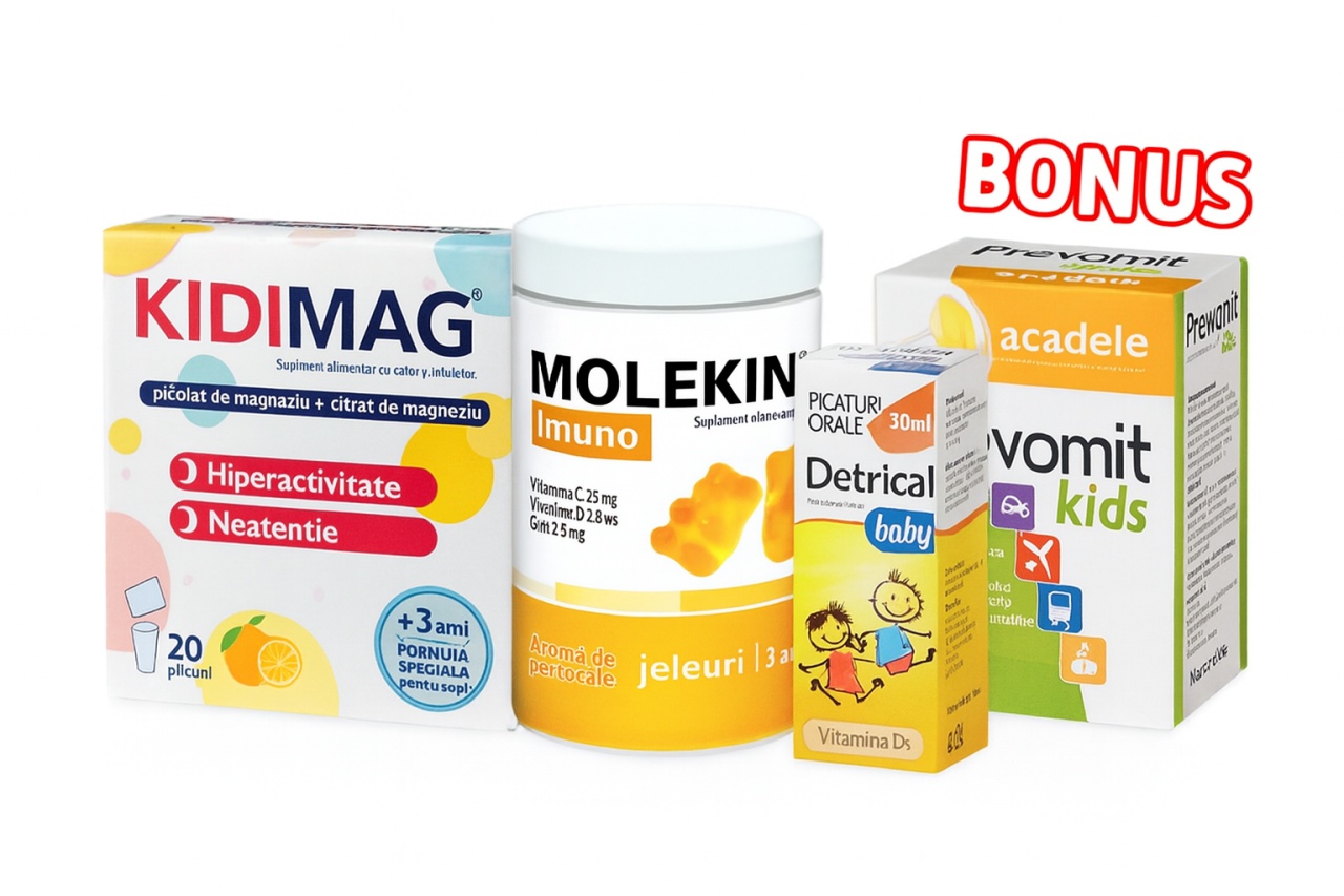 Kit Imunitate si Energie Copii 3+ ani – Zdrovit este creat pentru sustinerea copiilor activi, expusi zilnic la colectivitate. Combina nutrienti esentiali pentru imunitate, dezvoltare osoasa si echilibru energetic. Compozitie kit Molekin Imuno 3+ ani (60 jeleuri gumate) – vitamina C, vitamina D si zinc pentru imunitate puternica si protectie zilnica. Detrical Baby (30 ml picaturi orale) – vitamina D3 pentru sanatatea oaselor, a dintilor si pentru functionarea normala a sistemului imunitar. KidiMag (20 plicuri) – magneziu si vitamina B6 pentru reducerea oboselii, echilibru nervos si muscular. Cui se adreseaza Copiilor peste 3 ani, in special in sezonul rece. Parintilor care cauta o solutie completa pentru imunitate si energie. Copiilor activi, expusi la colectivitate, cu episoade frecvente de raceala sau oboseala. Beneficii cheie Sustine sistemul imunitar prin vitamina C, D si zinc. Contribuie la sanatatea oaselor si dintilor. Reduce oboseala si sprijina echilibrul nervos prin magneziu si B6. Kit complet, usor de administrat, cu produse marca Zdrovit. Mod de administrare (conform prospectelor produselor) Molekin Imuno 3+ ani: conform dozelor recomandate pe ambalaj. Detrical Baby: 1–2 picaturi/zi sau conform indicatiilor medicului pediatru. KidiMag: 1–2 plicuri/zi, dizolvate intr-un pahar mic cu apa. Dozele exacte se gasesc pe prospectul fiecarui produs.