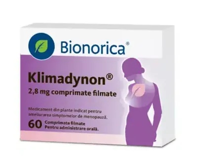 Klimadynon 2,8 mg comprimate filmate este un medicament din plante indicat la femei adulte pentru ameliorarea simptomelor de menopauză, cum sunt bufeurile și transpiraţiile profuze. Contraindicatii: Nu luaţi Klimadynon dacă sunteţi alergic (hipersensibil) la Cimicifuga racemosa sau la oricare dintre celelalte componente ale acestui medicament. Precautii: Înainte să utilizați Klimadynon, adresaţi-vă medicului dumneavoastră sau farmacistului. Sarcina şi alăptarea: Nu se recomandă utilizarea Klimadynon în timpul sarcinii. Când apar simptome de menopauză este încă posibil să rămâneți gravidă, prin urmare se recomandă să utilizați măsuri contraceptive eficace în timpul tratamentului cu Klimadynon. Nu se cunoaște dacă substanţa activă din Klimadynon se excretă în lapte la om. Klimadynon nu trebuie utilizat în timpul alăptării. Dacă sunteţi gravidă sau alăptaţi, dacă credeţi că sunteţi gravidă sau intenţionaţi să rămâneţi gravidă, adresaţi-vă medicului dumneavoastră pentru recomandări înainte de a lua acest medicament. Conducerea vehiculelor şi folosirea utilajelor: Nu au fost efectuate studii privind efectele asupra capacităţii de a conduce vehicule sau de a folosi utilaje. Mod de administrare: Luaţi întotdeauna acest medicament exact aşa cum este descris în acest prospect sau așa cum v-a spus medicul dumneavoastră sau farmacistul. Discutaţi cu medicul dumneavoastră sau cu farmacistul dacă nu sunteţi sigur. La femeile adulte aflate la menopauză doza uzuală este de un comprimat filmat de două ori pe zi, dimineața și seara (doza maximă este de 2 comprimate filmate pe zi). Pentru administrare orală. Comprimatele filmate se administrează cu o cantitate suficientă de lichid. A nu se mesteca sau suge. Dacă simpromele persistă pe parcursul tratamentului cu medicamentul, adresați-vă medicului sau farmacistului. Klimadynon nu trebuie utilizat mai mult de 6 luni fără recomandarea medicului. Utilizarea la copii și adolescenți: Nu există nicio utilizare relevantă a comprimatelor filmate Klimadynon la copii și adolescenți pentru indicația terapeutică dată. Categorii speciale de pacienți: Nu există date suficiente privind doza recomandată la pacienţii cu afectarea funcţiilor rinichilor/ficatului. Pacienții cu antecedente de boli ale ficatului nu trebuie să utilizeze Klimadynon fără recomandarea medicului. Dacă aveţi orice întrebări suplimentare cu privire la acest medicament, adresaţi-vă medicului dumneavoastră, farmacistului sau asistentei medicale. Compozitie: Substanța activă este 1 comprimat filmat conține: 2,8 mg extract uscat din rizom de cimicifuga (Cimicifuga racemosa (L.) Nutt., rhizoma) (5-10:1) Solvent de extracţie: etanol 58% (V/V) Celelalte componente sunt: Hidrogenofosfat de calciu dihidrat; copolimer metacrilat de amoniu, tip A, dispersie 30% (Eudragit RL 30D); oxid roşu de fer (E 172); oxid galben de fer (E 172); lactoză monohidrat; macrogol 6000; stearat de magneziu (vegetal); amidon de cartof; hidroxid de sodiu; acid sorbic; talc; dioxid de titan (E171). Prezentare: 60 comprimate filmate