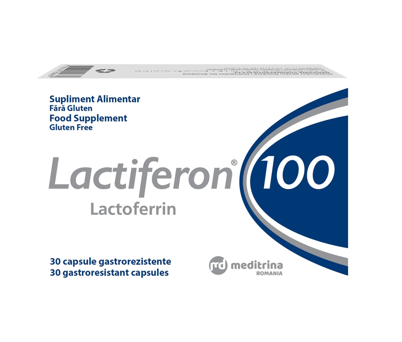 Lactiferon 100 mg, 30 capsule, Meditrina Lactiferon este un supliment alimentar pe bază de lactoferrină, o proteină extrasă din laptele de vacă, care aparține familiei transferinelor și se caracterizează printr-o înaltă capacitate de captare a ionilor de fier din organism. Preparat fără conținut de fier ionic cu eficiență demonstrată clinic în pre- venția anemiei feriprive. Studiile clinice au demonstrat ca afinitatea lactoferrinei de captare a fierului este de 300 de ori mai mare comparativ cu trans- ferină, contribuind la restabilirea homeostaziei fierului și prevenind deficitul de fier sau anemia feriprivă în timpul sarcinii sau alăptării. În studiile clinice, administrarea orală de Lactiferon® a crescut semnificativ valorile parametrilor hematologici (numărul trombocitelor din sânge, hemoglobina, feritina și fierul seric total), după 30 de zile de administrare. MOD DE ACȚIUNE Deblochează principalele depozite de fier din organism (enterocitul – celula intestinală unde se face absorbția fierului; hepatocitul – celula hepatică unde se stochează fierul; macrofagul- leucocita cu rol în fagocitarea eritrocitelor mature ce conțin o cantitate mare de fier sub formă de hemoglobină) și astfel mobilizează în organism o cantitate mult mai mare de fier versus orice preparat oral cu fier sau alimente într-un timp foarte scurt. Acțiune pleiotropică (protecție împotriva infecției și a inflamației). Aportul de lactoferrină conduce la scăderea secreției excesive de neutrofile (scă- derea procesului inflamator) și scăderea riscului de infecții fungice sau bacteriene (chiar sepsis în cazul copiilor prematuri cu greutate mai mică de 1500 g). Facilitează transportul fierului în organism și re-echilibrează homeostazia fierului prin distribuția rapidă a ionilor de fier în sânge și re-echilibrează rapid depozitele. COMPOZIȚIE: Fiecare capsulă conține 100 mg de lactoferrină liofilizată extrasă din lapte de vacă și excipienți. MOD DE ADMINISTRARE: 1 capsulă de 100mg Lactiferon de 2 ori pe zi (echivalent a 200 mg de lactoferrină/zi), cu cel putin 1 oră DUPĂ masă. CONTRAINDICAȚII: Nu prezintă. REACȚII ADVERSE: Administrarea a 200 mg pe zi de Lactiferon® s-a demonstrat a fi bine tolerată. Studiile clinice efectuate pe pacientele gravide cu deficit de fier, nu au raportat reacții adverse în urma administrării de Lactiferon®. Nu s-au observat efecte secundare similare preparatelor orale cu fier precum greață, vărsături, constipație, diaree, dureri abdominale, etc. AVERTIZĂRI ȘI PRECAUȚII: Lactiferon® este un derivat din lapte de vacă, a nu se administra în caz de intoleranța la lactoză. Produsul este un supliment alimentar și nu poate înlocui o dieta variată și echilibrată și un mod de viață sănătos. SARCINĂ ȘI ALĂPTARE : Lactiferon® poate fi administrat pe durata sarcinii și alăptării. COPII ȘI ADOLESCENȚI: administrarea Lactiferon® este permisă la nou-născuți, copii, adolescenți sau adulți PREZENTARE: Cutie cu 30 capsule gastrorezistente.