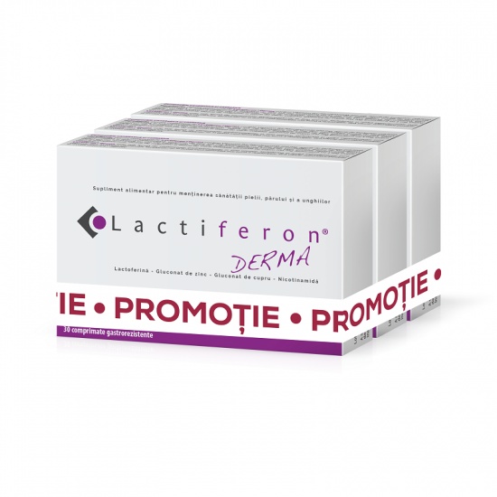 Lactiferon Derma, 30 comprimate, oferta 2+1gratuit, Meditrina Proprietati: Lactiferon® Derma comprimate gastrorezistente este un supliment alimentar indicat pacienților cu acnee, rozacee și alte afecțiuni cutanate asociate cu hiperseboree și inflamație (ex. dermatită seboreică). Fiecare comprimat conține Lactoferină pura 100 mg, Gluconat de zinc 15 mg, Nicotinamidă 300 mg și Cupru 1 mg; Lactoferina este o proteină multifunctională din familia transferinelor, care face parte din prima linie de apărare a organismului; Proprietățile antimicrobiene și antiinflamatoare ale lactoferinei, care are un spectru de acțiune larg împotriva a numeroase microorganisme patogene, inclusive asupra bacteriilor care cauzeaza acneea; Contribuie la reducerea numarului de bacterii care favorizeaza aparitia cosurilor inflamate si la reechilibrarea secretiei de sebum; Zincul sub forma de gluconat are o biodisponibilitate mai mare decat alte forme de zinc si este un mineral foarte important pentru sanatatea pielii; Administrarea zincului la pacientii cu acnee poate contribui la reducerea numarului de leziuni inflamatorii si a secretiei de sebum; Nicotinamida este un alt ingredient recunoscut pentru proprietățile sale antibacteriene, antiinflamatoare și antiseboreice, cu rezultate vizibile in acnee si seboree inca din primele saptamani de administrare; Cuprul este un mineral esențial pentru buna funcționare a proceselor pielii, cu efect bactericid important împotriva a numeroase bacterii Gram-pozitive și negative; Administrarea orală a zincului pe perioade îndelungate poate induce hipocupremie, de aceea este necesară asocierea acestui mineral în timpul tratamentului; Concentratia de ingrediente active este perfect echilibrata pentru a avea efecte benefice in acnee si hiperseboree, dar totodata pentru a mentine un profil inalt de siguranta pentru pacienti; Lactiferon Derma® este sub forma de comprimate gastrorezistente și, prin urmare, lactoferina și restul ingredientelor sunt eliberate doar la nivelul intestinului, facilitându-se în acest mod absorbția mai buna a nutrientilor. Mod de administrare: Se recomandă administrarea a 1-2 comprimate gastrorezistente pe zi, în timpul mesei, timp de 12 săptămâni. Ingrediente: Fiecare comprimat de Lactiferon Derma® conține Vitamina B3/Nicotinamidă 300 mg, agenți de încărcare: celuloză microcristalină și hidroxipropilceluloză, gluconat de zinc 118 mg (echivalent cu 15 mg Zinc elementar), acetat de lactoferină (lapte) 117 mg (echivalent cu 100 mg Lactoferină), agent de acoperire: Sepifilm® (dioxid de titan, glicerol, hipromeloză, talc), agenți antiaglomeranți: stearat de magneziu și dioxid de siliciu coloidal, gluconat de cupru 7,14 mg (echivalent cu 1 mg Cupru elementar). Precautii: LACTIFERON® Derma comprimate gastrorezistente conține lactoferină, o glicoproteină izolată din lapte de vaca; a nu se utiliza în caz de intoleranță sau alergie la laptele de vaca sau la oricare dintre ingrediente. A nu se depăși doza recomandată pentru consumul zilnic. Produsul este un supliment alimentar și nu trebuie să înlocuiască o dietă variată și echilibrată și un stil de viață sănătos. Prezentare: 3 cutii x 30 comprimate