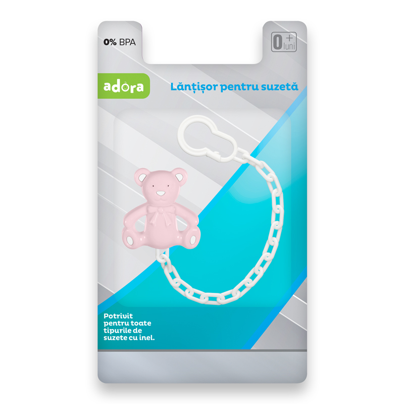 Lantisorul Adora protejeaza de cadere, pierdere si murdarie, suzeta favorita a copilului.