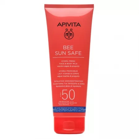 Lapte cu protectie solara SPF50 pentru corp si ten Bee Sun Safe, 200ml, Apivita Această loțiune solară pentru față și corp cu alge marine și propolis oferă o senzație imediată de prospețime și hidratează pielea. Caracteristici: Se absoarbe instantaneu datorită texturii sale ușoare de gel-cremă. Este ideală pentru protecție în timpul activităților de vară deoarece este foarte rezistentă la apă, rezistentă la nisip și transpirație. Parfumul său proaspăt de vară lasă un miros unic pe piele. Oferă protecție cu spectru larg UVA și UVB cu o combinație de filtre solare foto-stabile. Hidratează instantaneu pielea cu alge marine, aloe și acid hialuronic. Previne îmbătrânirea prematură datorită extractului patentat de propolis. Oferă un bronz natural sublim care rezistă datorită extractului de roșcove. Testat dermatologic. Produsele de protecție solară APIVITA BEE SUN SAFE respectă pielea și ecosistemul marin. Acestea sunt realizate cu formule curate care includ ingrediente biodegradabile și nu includ filtre solare care sunt dăunătoare pentru corali. APIVITA folosește ambalaje responsabile, cu materiale reciclate și reciclabile. Mod de utilizare: Înainte de expunerea la soare, aplicați o cantitate suficientă (o jumătate de linguriță pentru față și 6 lingurițe pentru corp). Reaplicați frecvent, mai ales după transpirație, înot sau ștergerea cu prosopul. Reducerea acestei cantități va reduce semnificativ nivelul de protecție. Evitați expunerea îndelungată la soare, chiar dacă folosiți produs de protecție solară. Evitați zona ochilor. Nu expuneți bebelușii și copiii la lumina directă a soarelui. Precautii: Evitați expunerea îndelungată la soare, chiar dacă folosiți produs de protecție solară. Evitați zona ochilor. Nu expuneți bebelușii și copiii la lumina directă a soarelui. Ingrediente: Aqua (Water)**, Propanediol, Diethylamino Hydroxybenzoyl Hexyl Benzoate, Bis-Ethylhexyloxyphenol Methoxyphenyl Triazine, Ethylhexyl Salicylate, Ethylhexyl Triazone, Triheptanoin, Isoamyl Laurate, Glycerin, C9-12 Alkane, Parfum (Fragrance), Silica, C13-15 Alkane, Aqua (Water), Maris Aqua (Sea water), Hydrolyzed Algin, Chlorella Vulgaris Extract, Propolis Extract, Rosa Canina Fruit* Extract, Panthenol, Aloe Barbadensis Leaf Juice Powder*, Helianthus Annuus (Sunflower) Seed Oil*, Sodium Hyaluronate, Inositol, Tocopherol, Allantoin, Tocopheryl Acetate, Hydroxypropyl Cyclodextrin, Acrylates/C10-30 Alkyl Acrylate Crosspolymer, Coco-Caprylate/Caprate, Glyceryl Stearate, PEG-100 Stearate, Sorbitan Oleate, Disodium EDTA, Xanthan Gum, Carbomer, Triacontanyl PVP, Citronellyl Methylcrotonate, Hydroxyacetophenone, Ethylhexylglycerin, Sodium Hydroxide. *Agricultură organică **Infuzie de fructe de Rosa Canina* Prezentare: 200ml