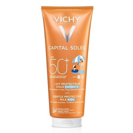 Lapte hidratant pentru copii Capital Soleil SPF50+, 300ml, Vichy Proprietati: lapte hidratant pentru copii ce poate fi utilizat și ca o cremă de față SPF 50 pentru copii cu textură catifelată și confortabilă ce asigură o pătrundere lentă în piele, pentru o protecţie de durată și rezistentă la apă, lucru care îl va încânta pe copilul dumneavoastră; pentru a lupta împotriva efectelor nocive ale radiațiilor UV şi pentru a proteja capitalul genetic al pielii copiilor, Laboratoarele Vichy au inclus în acest lapte de corp pentru copii un sistem de filtrare a radiațiilor UVA-UVB cu spectru larg, fotostabil, pe bază de Mexoryl, asigurând protecție solară pentru copii de calitate; lapte hidratant pentru copii ce poate fi folosit și ca o cremă de față SPF50 pentru copii; fara parfum, fara parabeni, fara coloranti, cu formulă hipoalergenică testată pentru compatibilitate cu pielea sensibilă, sub control dermatologic și pediatric; imbogățit cu apă termală Vichy, calmantă, fortifiantă, regenerantă; protejează pielea delicată a copiilor dumneavoastră de razele UV. Ingrediente active: Apa Vulcanică Vichy – fortifică bariera naturală a pielii. Apa Vulcanică Vichy a luat naștere în regiunea vulcanică Auvergne. Bogată în 15 minerale esențiale. Vitamina E – antioxidant. Protejează pielea de radicalii liberi. Mod de utilizare: Aplicați laptele de corp pentru copii chiar înainte de expunerea la soare, precum și după ce copiii au intrat în contact cu apa. Ingrediente: AQUA / WATER – HOMOSALATE – DROMETRIZOLE TRISILOXANE – ETHYLHEXYL SALICYLATE – BIS-ETHYLHEXYLOXYPHENOL METHOXYPHENYL TRIAZINE – ETHYLHEXYL TRIAZONE – GLYCERIN – BUTYL METHOXYDIBENZOYLMETHANE – ISOHEXADECANE – ALCOHOL DENAT. – PROPANEDIOL – DICAPRYLYL ETHER – STYRENE/ACRYLATES COPOLYMER – DIMETHICONE – ACRYLATES/DIMETHICONE COPOLYMER – ASCORBYL PALMITATE – CAPRYLYL GLYCOL – CARBOMER – GLYCERYL OLEATE – HYDROGENATED PALM GLYCERIDES CITRATE – LECITHIN – NYLON-12 – p-ANISIC ACID – PEG-8 LAURATE – PHENOXYETHANOL – SODIUM DODECYLBENZENESULFONATE – TOCOPHEROL – TRIETHANOLAMINE – TRISODIUM ETHYLENEDIAMINE DISUCCINATE. Prezentare: 300ml