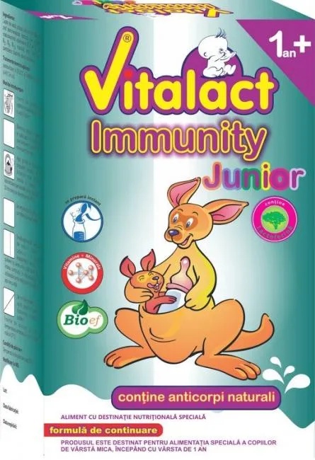 Lapte praf Vitalact Immunity Junior +1an, 400g, Bloef Vitalact Immunity Junior +1 an intareste sistemul imunitar al copilului si stimuleaza activitatea acestuia prin intermediul anticorpilor (imunoglobulinelor) din colostru. Asigura un aport energetic ridicat in conformitate cu cerintele copiilor de varsta mica. Este usor tolerat si acceptat de catre copii. Contine colostru bovin cu un continut ridicat de anticorpi naturali, prelucrat printr-un procedeu care sa-i pastreze intacte toate componentele active si care sa asigure biodisponibilitatea acestora. Contine lactoferina, separata din lapte de vaca, care imbunatateste transportul si asimilarea fierului in organism. Intareste sistemul imunitar al copilului si stimuleaza activitatea acestuia prin intermediul anticorpilor (imunoglobulinelor) din colostru. Bogat in vitamine, minerale si aminoacizi de baza. Contine acizi grasi polinesaturati proveniti din surse naturale (amestec de grasimi vegetale). Prezentare: 400g