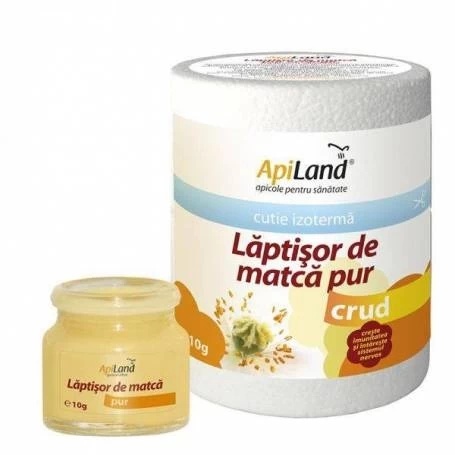 Lăptișor de matcă, pulbere, 10g, Apiland Descriere generală: Lăptișorul de matcă, sub formă de pulbere, de la Apiland, este un supliment alimentar cunoscut drept „elixir al tinereții”. Acesta contribuie la tonifierea, energizarea și revitalizarea organismului. Lăptișorul de matcă poate susține efortul fizic și intelectual, combate surmenajul, astenia și stresul, sprijină funcția sexuală și reglarea hormonală. De asemenea, are efect antioxidant și antitumoral natural, crește imunitatea și rezistența organismului, revitalizează tenul obosit și previne căderea părului. Acest produs poate susține sănătatea generală și bunăstarea, dar nu înlocuiește tratamentele medicale sau sfaturile profesionale. Mod de administrare: Pentru copii, se recomandă administrarea a 0,5 g pe zi, iar pentru adulți, între 1 și 2 g pe zi. Se recomandă cure de minimum 6 săptămâni pentru efecte optime. Precauții și contraindicații: Produsul nu este recomandat persoanelor alergice la lăptișor de matcă sau la alte produse apicole. Consultați medicul înainte de utilizare dacă aveți condiții medicale preexistente. Reacții adverse (dacă este cazul): Nu sunt cunoscute reacții adverse majore. În cazuri rare, pot apărea reacții alergice. Întrerupeți utilizarea și consultați medicul dacă apar simptome neobișnuite. Sarcina, alăptarea și fertilitatea: Nu există suficiente studii privind utilizarea lăptișorului de matcă în timpul sarcinii și alăptării. Se recomandă consultarea medicului înainte de utilizare. Nu sunt cunoscute efecte asupra fertilității. Cum se păstrează: A se păstra la frigider, între 2ºC și 6ºC. Cutia izotermă menține lăptișorul la temperatura optimă și protejează transportul până la 48 de ore. Compoziție: Lăptișor de matcă pur. Prezentare: Cutie termoprotectoare cu pulbere de lăptișor de matcă, 10 g. Atenționare: Citiți cu atenție și în întregime prospectul înainte de a începe să utilizați acest medicament deoarece conține informații importante pentru dumneavoastră.