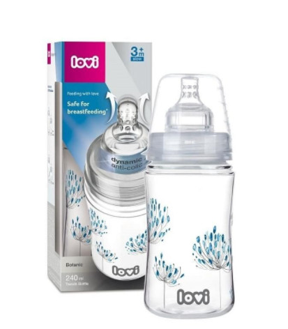 LOVI Biberon botanic 240ml 21/584 LOVI Trends Biberon pentru hranirea bebelusilor cu lapte colectat de la sanul mamei. Imprimat de jur imprejur, cu un design aflat in ultimele tendinte ale modei. Echipat cu tetina dinamica unica cu varf subtire, proeminent, o baza dura profilata si un sistem eficient de elimnare a aerului. Disponibil in doua colectii:Indian Summer si Botanic. Biberonul este compatibil cu toate pompele pentru san LOVI. Brandul LOVI recomanda alaptarea ca fiind cea mai sanatos metoda de alimentare . Metodele alternative de alimentare ar trebui utilizate doar dupa consultarea unui medic, moasa sau farmacistdaca alaptarea nu este posibila sau este insuficienta .