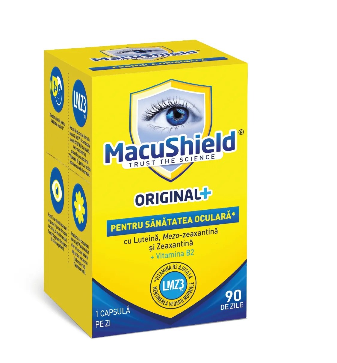 MacuShield Original+, 90 capsule, MacuVision Proprietati: MachiShield contine LMZ3, un ingredient brevetat unic, pentru a obtine nivelurile corespunzatoare de luteina,mezo-zeaxantina intr-o forumula specifica. acesti 3 caroteni maculari se gasesc in partea din spate a ochiului, la nivelul maculei, formand pigmentul macular ( de culoare galbena ). mezo zeaxantina se gaseste numai in centrul maculei si este extrasa din flori de Craite ( Tagetes erecta I.), cultivate cu o tehnologie care permite imbogatirea in aceasta substanta activa. In cantitati mai mici, mezo-zeaxantina se gaseste si un unele