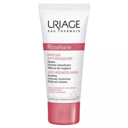 Masca anti-roseata Roseliane, 40ml, Uriage Masca reconfortantă pentru pielea sensibilă, iritată, predispusă la rozacee, după tratamentele estetice (laser) sau pentru a calma senzațiile de căldură de la nivelul feței. Proprietati: calmează imediat, răcorește și hidratează; bogată in apă termală Uriage cu proprietăți hidratante și calmante, precum și in complexul Cerasterol-2F care regenerează în mod durabil bariera cutanată, această mască anti-roșeață hidratează și asigura confortul imediat și de lungă durată al pielii; intărește pereții vasculari; extractele din ginseng și alge roșii intăresc pereții vaselor de sânge, reducând apariția acestora la suprafața pielii; complexul TLR2-Regul și complexul SK5R (Specific-Kallikrein-5-Regulator) regleaza activitatea Kallikrein-5, o proteaza care cauzează inflamație și probleme vasculare și asigura o acțiune calmantă eficientă; este hipoalergenica si non-comedogenica. Ingrediente active: Apă termală Uriage, Cerasterol-2F, Complex SK5, Complex TLR2-REGUL, Gume Biozaharide, Particule verzi sidefate, Glicerină, Unt de Shea. Compozitie: AQUA – DIMETHICONE – GLYCERIN – HYDROGENATED POLYISOBUTENE – BUTYLENE GLYCOL – BUTYROSPERMUM PARKII (SHEÂ) BUTTER – CETEARYL ETHYLHEXANOATE – SODIUM POLYACRYLATE – ACRYLATES/C10-30 ALKYL ACRYLATE CROSSPOLYMER – CI 77891 (TITANIUM DIOXIDE) – CHLORPHENESIN – PARFUM (FRAGRANCE) – PHENOXYETHANOLo-CYMEN-5-OL – TOCOPHERYL ACETATE – BIOSACCHARIDE GUM-1 – PANAX GINSENG ROOT EXTRACT – SORBITOL – MALTODEXTRIN – SODIUM CITRATE – XANTHAN GUM – CITRIC ACID – ASIATICOSIDE – BRASSICA CAMPESTRIS (RAPESEED) STEROLS – PHYTOSPHINGOSINE – RASPBERRY SEED OIL/PALM OIL AMINOPROPANEDIOL ESTERS – ASCOPHYLLUM NODOSUM EXTRACT – ASPARAGOPSIS ARMATA EXTRACT – CI 14700 (RED 4) – POTASSIUM SORBATE. Mod de administrare: Aplicați în strat generos de 2 ori pe săptămână pe fața curată, evitând conturul ochilor. Lăsăți produsul să acționeze 10-15 min, apoi se clătește, sau se poate lăsa întreaga noapte sa acționeze și îl îndepărtați dimineața. Prezentare: 40ml