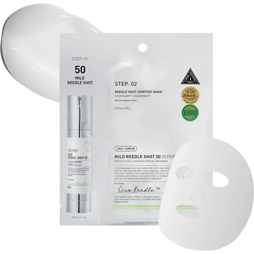 Masca faciala in 2 pasi tip servetel Reedle Shot, 1.5g, VT Cosmetics VT Cosmetics Mild Reedle Shot 50 2-Step Mask este o mască inovatoare în două etape, special formulată pentru pielea sensibilă sau pentru utilizatorii care doresc să experimenteze tehnologia CICA REEDLE într-o concentrație mai blândă. Pasul 1 conține Mild Reedle Shot 50 Essence , cu 38.000 de micro-particule de origine minerală denumite CICAREEDLE , care ajută la îmbunătățirea absorbției ingredientelor active fără a irita pielea. Pasul 2, masca textilă Reedle Shot Comfort , este îmbogățită cu CICAHYALON și extracte botanice calmante, care oferă hidratare profundă și confort pielii. Mod de utilizare: Pasul 1 – Aplicați esența Mild Reedle Shot 50 pe tenul curat, evitând zona ochilor și a buzelor. Masați ușor până la absorbție completă. Pasul 2 – Aplicați masca textilă Reedle Shot Comfort și lăsați să acționeze 10-20 de minute. Îndepărtați masca și masați ușor esența rămasă în piele. ? Notă: Este posibil să resimțiți o ușoară senzație de furnicături la aplicare – un efect normal al particulelor CICAREEDLE care facilitează absorbția ingredientelor active. Formulă testată dermatologic, potrivită pentru utilizare zilnică, chiar și pe tenul sensibil sau reactiv. Pentru uz extern. A nu se utiliza pe pielea rănită sau iritată. Evitați contactul cu ochii. Întrerupeți utilizarea în caz de reacții adverse. A nu se lăsa la îndemâna copiilor.