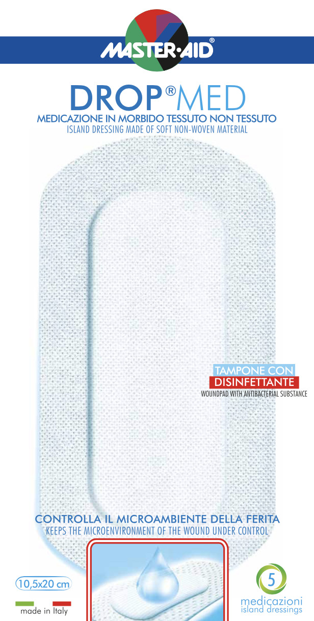 Pansament postoperator Drop Med, Master- Aid, 10,5X20 cm, 5 bucati Producător – Pietrasanta Pharma Spa Cod EAN -8032956140167 Pansament steril, autoadeziv, ambalat individual. Tampon central cu dezinfectant. Se poate utiliza după interventii chirurgicale, inclusiv si pe plăgi deschise. Dimensiunea tamponului central este de 15.2×6 cm. Proprietati: – Acoperirea plagilor postoperatorii – Barieră