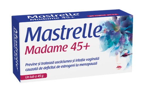 Mastrelle® Madame 45+ contine izoflavone din soia si acid hialuronic ce asigura rehidratarea stratului superior al mucoasei vaginale. Aplicarea gelului vaginal Mastrelle® Madame 45+ ajuta la formarea unui film protector, rehidrateaza, asegura o buna lubrefiere si imbunatateste calitatea tesutului vaginal. Actiunea sa trofica se datoreaza extractului de soia concentrat si standardizat in izoflavone 40% si acidului hialuronic incorpórate intr-un gel-crema cu textura usoara, negrasa, sub forma unei emulsii ulei in apa. Avantaje Mastrelle® Madame 45+ are o textura usoara, negrasa, sub forma unei emulsii ulei in apa, care asigura un pH (pH=5) apropiat de cel al mucoasei vaginale la menopauza. Compozitie Extract de boabe de soia (Glycine max) standardizat in isoflavone 40%, hialuronat de sodiu, carbomer, trietanolamina, parafina lichida, glicerina, extract glicolic de galbenele (Calendula oficinalis), extract glicolic de aloe (Aloe vera), propilenglicol, metilparaben, etilparaben, fenoxietanol. Indicatii Mastrelle® Madame 45+ gel vaginal este eficient in hidratarea si lubrifierea mucoasei vaginale, restabilirea elasticitatii normale, precum si in tratamentul si preventia uscaciunii vaginale datorate deficitului fiziologic de estrogeni din timpul premenopauzei, menopauzei si postmenopauzei, sau deficitului indus de estrogeni ce apare posthisterectomie (totala sau partiala) sau in timpul folosirii de contraceptive. Ajuta in procesul natural de vindecare a microleziunilor induse prin frictiunea de la nivelul mucoasei vaginale. Doze si mod de administrare Frecventa de aplicare depinde de intensitatea uscaciunii vaginale. Se recomanda o aplicare la 3 – 4 zile, daca medicul nu prescrie altfel. Recomandari Daca ambalajul prezinta deteriorari ce compromit integritatea tubului, nu folositi acest produs. Nu aruncati ambalajul gol in mediul inconjurator. Nu lasati la indemana copiilor. Pastrati la temperaturi sub 25 grade C in ambalajul original. Mod de eliberare Fara prescriptie medicala. Forma de prezentare Cutie de carton cu un tub de aluminiu cu 45g gel si un aplicator vaginal. Mastrelle® Madame 45+ gel vaginal este un dispozitiv medical de clasa I nesteril si fara functie de masurare conform clasificarii date de Directiva Consiliului European pentru dispozitive medicale 93/42/EEC.