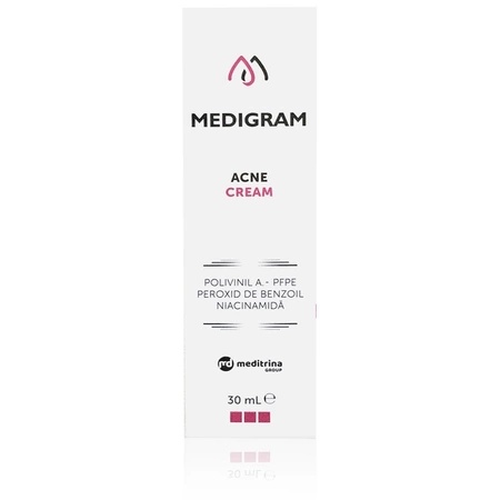 Medigram Acne crema, 30ml, Meditrina Medigram este un dispozitiv medical nesteril de clasa III, indicat pacienţilor cu ten acneic pentru a preveni complicaţiile induse de acnee si recidiva cauzată de factorii externi. Alcoolul polivinilic şi polieter perfluorinat din compoziţia sa formează o pelicula neocluzivă, invizibilă, care izolează şi protejează pielea de factorii externi care pot determina agravarea simptomelor acneei. Acţiunea complementară a peroxidului de benzoil, cu efect exfoliant, favorizează eliminarea mecanică a celulelor moarte şi combate înmulţirea bacteriilor, fără a determina dezechilibre la nivelul microbiomului cutanat. Medigram crema conţine şi principii active cu acţiune emolientă şi calmantă precum niacinamida, care reechilibrează bariera lipidică a pielii şi stimulează producţia de ceramide şi acizi graşi, atenuând în acest fel exfolierea excesivă a pielii. Favorizează hidratarea cutanată prin stoparea pierderilor de apă transepidermice şi implicit reduce riscul de eritem local. Mod de utilizare: A se utiliza produsul conform indicaţiilor medicului. Conform indicaţiilor medicale se recomanda curăţarea atentă a pielii şi aplicarea produsului de preferat seara, pe zonele care necesită tratamentul, distribuind crema in mod uniform. Nu este indicată utilizarea produsului pe o perioadă mai mare de 4 săptamani consecutive, cu excepţia cazurilor în care medicul recomandă o durată mai mare de tratament. Flaconul airless este dotat cu o pompită care la fiecare apăsare eliberează 0,25 ml de cremă, asigurând doza optimă de produs necesară pentru tratament. Precautii: A nu se aplica crema la nivelul ochilor; în caz de contact accidental cu ochii sau mucoasele, se recomandă clătirea cu apă din abundenţă Aplicaţi produsul cu mâinile curate şi uscate. A se depozita departe de surse directe de caldură. Aplicaţi pe pielea fără leziuni deschise. Evitaţi utizarea concomitentă cu alte preparate care conţin substanţe cu efect de peeling mecanic precum alcoolul polivinilic şi polieter perfluorinat. A nu se lăsa la îndemâna sau vederea copiilor. Doar pentru uz topic, extern. Deoarece nu au fost efectuate studii privind siguranţa produsului la gravide, nu se recomandă utilizarea în timpul sarcinii. Consultaţi medicul în caz de utilizare prelungită sau hipersensibilitate cunoscută la componentele produsului. Data de expirare se referă la produsul intact, depozitat în mod corect. A nu se arunca recipientul în mediu după utilizare. Evitaţi expunerea directă la soare sau aparate de bronzat. Peroxidul de benzoil din compoziţie poate determina decolorarea pielii, părului sau ţesăturilor. Administrarea topică a produsului, mai ales pe perioade îndelungate, poate determina fenomene de hipersensibilizare sau intolerantă (precum arsură sau iritaţie); în aceste cazuri se recomandă întreruperea tratamentului şi consultarea medicului sau farmacistului. Ingrediente: Alcool Polivinilic, Perfluoropolieter, Niacinamidă, Peroxid De Benzoil, Pantenol, Tocoferol, Alcool Cetil Stearilic, Stearat De Poligliceril-10, Tristearat De Poligliceril-6, Hidroxipropil Guar, Stearat De Gliceril, Izononanoat De Cetilstearil, Dimeticona, Dipropilen Glicol, Caprylil Glicol, Laurat De Gliceril, Fenilpropanol, Alcool Denat., Sare Disodică EDTA. Apă Purificată. Prezentare: 30ml