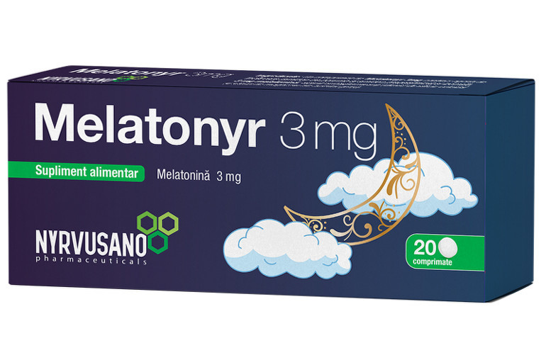 MELATONYR 20 COMPRIMATE Melatonyr este indicat pentru persoane care: Au probleme cu secretia de melatonina; Sufera de oboseala cronica; Calatoresc mult; Lucreaza noaptea; Sunt suprasolicitate fizic sau intelectual; Beneficii potentiale: Te ajuta sa adormi mai repede; Te ajuta sa mentii un somn odihnitor; Te ajuta sa te trezesti mai odihnit; Administrare: 1 comprimat pe zi sau in functie de recomandarea medicului. Compozitie: Melatonina 3 mg