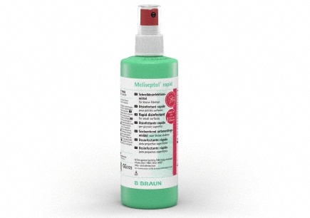 Dezinfectant pentru suprafețe mici, Meliseptol rapid Utilizare: Adecvat pentru suprafețele dispozitivelor medicale rezistente la alcool (scaune de examinare, paturi de spital și echipamente din sala de operații). A nu se utiliza pe dispozitive invazive. Mod de utilizare: Umeziți suprafața cu soluție nediluată până când aceasta este complet udă. Durată de expunere: 1 minut. Prezentare: 250 ml