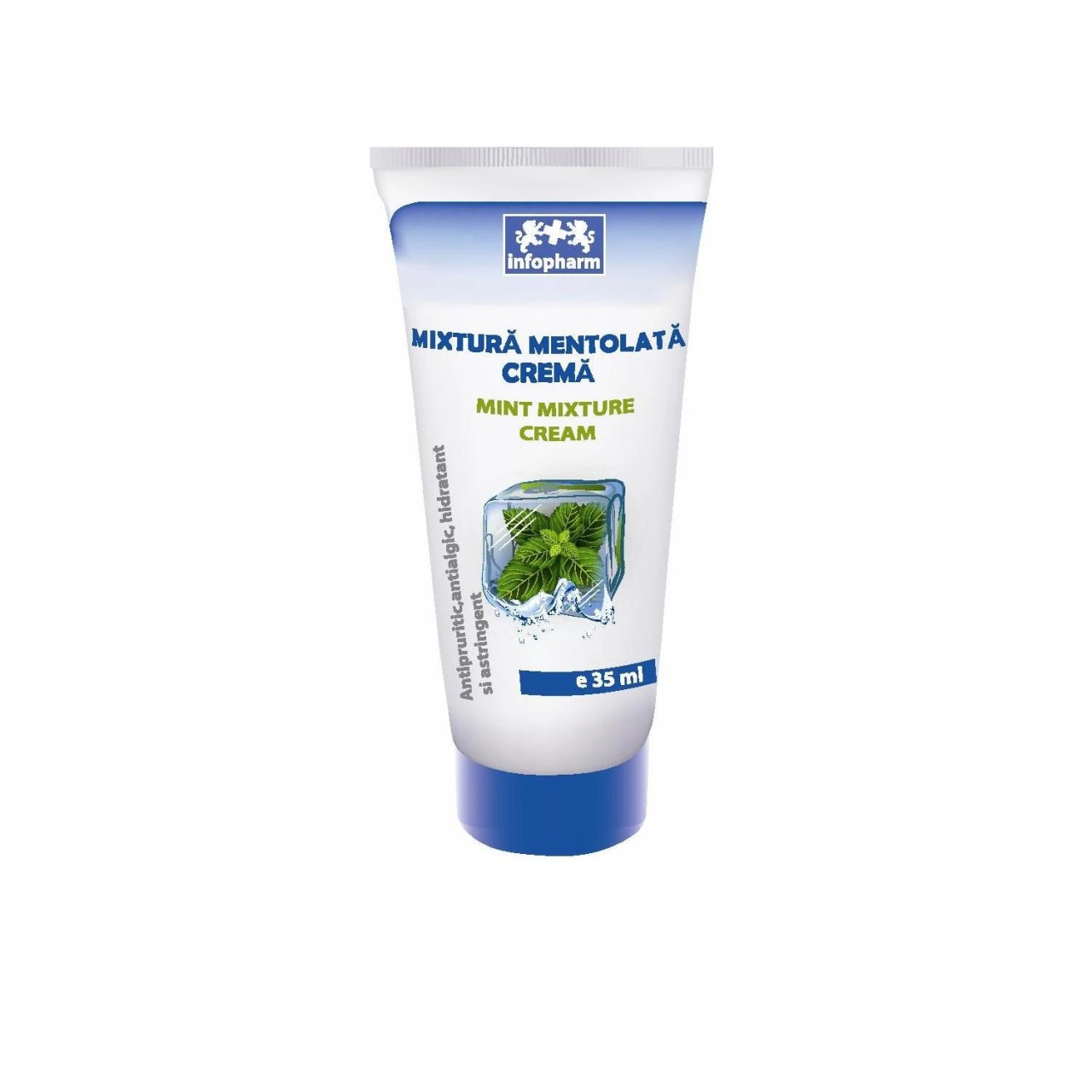 Crema mixtura mentolata, 35ml, Infopharm Mixtura mentolata este o crema cu proprietati calmante ce reduce inflamatia prin senzatia de racorire a pielii. Se recomanda a fi utilizata ca antipruritic si topic dermal in eruptii cutanate sau intepaturi de insecte. Mentolul din compozitie joaca rol antipruriginos iar Oxidul de zinc este un princpiu activ cu proprietati antiinflamatoare si calmante ale pielii. Glicerina la randul ei este un puternic hidratant si transportator al substantelor active. Compozitie : mentol talc oxid de zinc glicerina carbomer apa distilata Mod de utilizare: Uz extern. Se aplica pe piele si se maseaza usor formand un strat subtire, protector. Contraindicatii: A se evita zona ochilor si a gurii. Efecte: calmant, racoritor, antipruritic, antialgic, astingent, stimuleaza circulatia sanguina Prezentare: 35ml