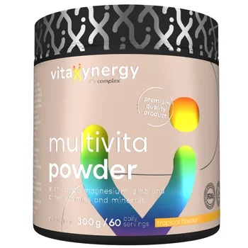 Multivitamine pudra cu aroma de fructe tropicale, 300g, VitaXynergy Obtine toate vitaminele si mineralele esentiale cu Vitaxynergy Multivita Powder Tropical, o formula completa si delicioasa pentru vitalitate zilnica. Beneficii: Aroma tropicala placuta, ideala pentru toate varstele; Vitaminele B si C contribuie la reducerea oboselii si extenuarii; Vitaminele C si D sustin functionarea normala a sistemului imunitar; Vitaminele B si zincul sprijina functia cognitiva normala; Sanatatea pielii si parului: Biotina si zincul contribuie la mentinerea sanatatii pielii si parului; Vitaminele B si magneziul contribuie la metabolismul energetic normal; Fiecare doza contine vitamine si minerale esentiale in concentratii optime pentru sanatatea generala; Pulberea se dizolva usor in apa, oferind o administrare placuta si convenabila; Formulat cu ingrediente de inalta calitate, garantand eficacitatea si siguranta utilizarii; O cutie contine 300g de pulbere, asigurand un tratament eficient si convenabil. Ingrediente per 100 g produs/per portie (5 g): Vitamina A 4800 µg/ 240 µg (30%**); vitamina B1 600 mg/ 30 mg (2727%**); vitamina B2 240 mg/ 12 mg (857%**); niacina 600 mg/ 30 mg (186%**) ; acid pantotenic 600 mg/ 30 mg (500%**); vitamin B6 120 mg/ 6 mg (428%**); acid folic 2400 µg/ 120 µg (60%**); vitamina B12 1000 µg/ 50 µg (2000%**); vitamina C 8000 mg/ 400 mg (500%**); vitamina D 100 µg/5 µg (100%**); vitamina E 520 mg/26 mg (216%**); vitamina K 1200 µg/ 60 µg (80%**); biotina 8000 µg/ 400 µg (800%*); magneziu 2250 mg/ 113 mg (30%**); zinc 80 mg/ 4 mg (40%**); cupru 20 mg/ 1 mg (100%**); crom 609 µg/ 30 µg (75% **); seleniu 1305 µg/65 µg (118%**); iod 900 µg/ 45 µg (30%**); mangan 40 mg/ 2 mg (100%**); extract din fruct de portocala amara (Citrus aurantium) 800 mg/ 40 mg, din care bioflavonoide din citrice 480 mg/ 24 mg. Mod de utilizare: 5 grame pe zi (1 lingurita). Portii per cutie: 60 Prezentare: 300g